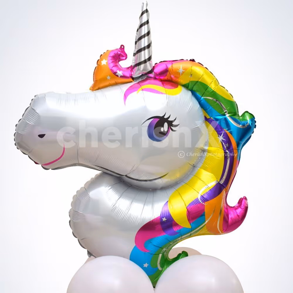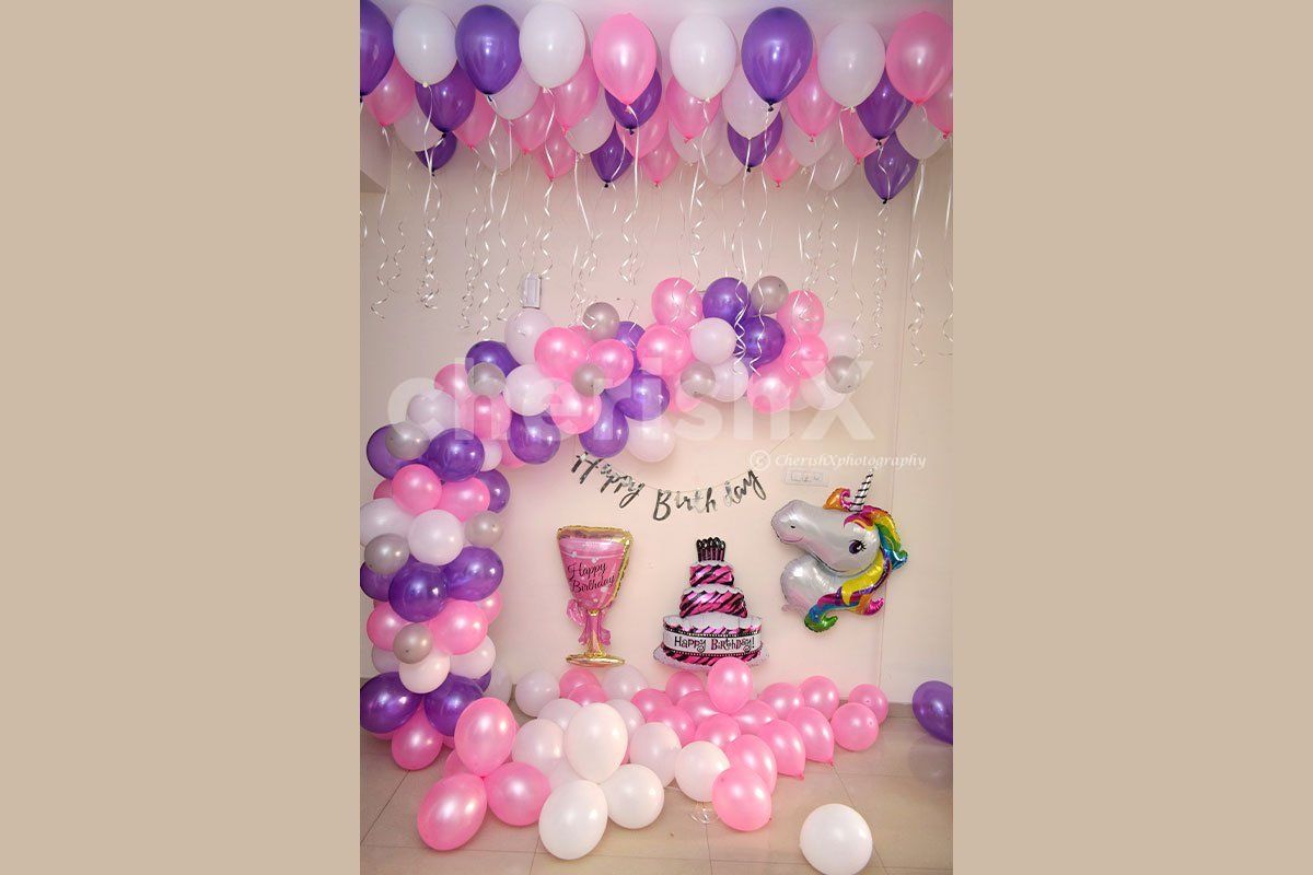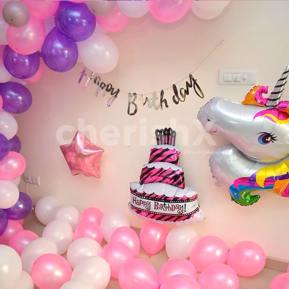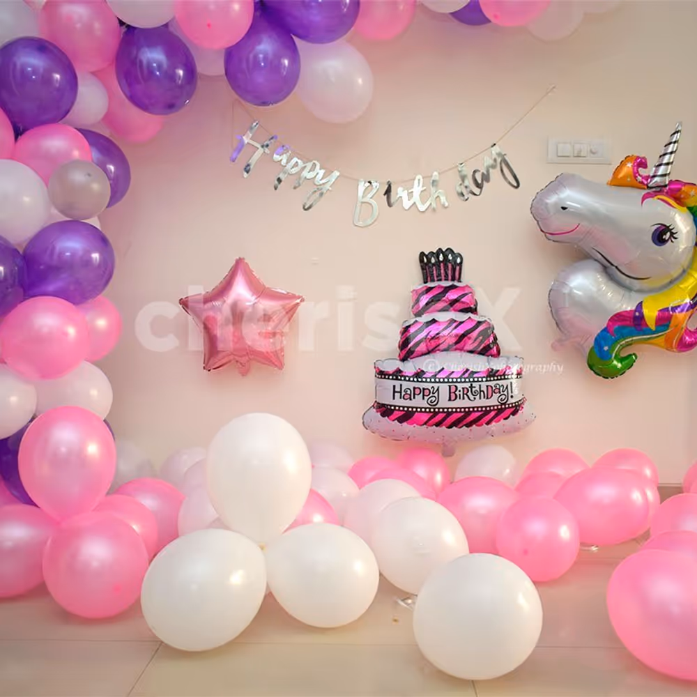 Unicorns are dreamy creatures- straight out of fairy tales! Gift your loved one the feeling of being in a fairy tale by getting this amazing unicorn decoration done for them at their home! We bring to you an artistic decoration crafted with 40 pink, white, and purple latex balloons attached to the ceiling with soft removable tape and ribbons dsngling from it, Along with an arc made of 80 latex balloons of the same colours as well as 10 metallic silver balloons, 1 happy birthday cake foil balloon, 1 happy birthday silver bunting, 1 big unicorn foil balloon, 2 silver star-shaped foil balloons, and last but not the least- 15 white and 15 pink balloons strewn sweetly on the floor.