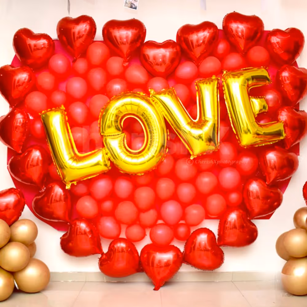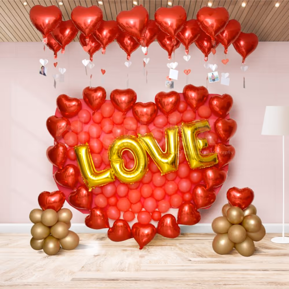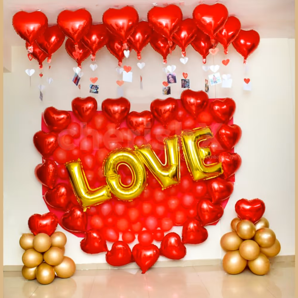 "One of the most special feelings is the feeling of being in love. And one of the most special moments in anyone's life is when they express their feelings to their loved one, crush, or special someone! When proposing to someone, propose in style and make the memory an unforgettable one. Our exclusive proposal decor has been crafted by our decoration experts just for this purpose- so that he/she says a definite 'yes' when you pop the big the question! This beautiful, romantic, and red-themed package consists of 18 red heart-shaped foil balloons stuck on the cieling with your photos hanging from them, 3 strings of heart hangings, 20 heart-shaped foil balloons used to form a big heart on the wall, 60 red normal balloons used to create big heart-shape on the wall, 1 large lettered foil balloon that says 'LOVE', and 24 golden chrome balloons to create centrepieces. Whats more, this decoration will be done by our team at your home or a location of your choice. So dont wait, buy now and propose before it's too late!