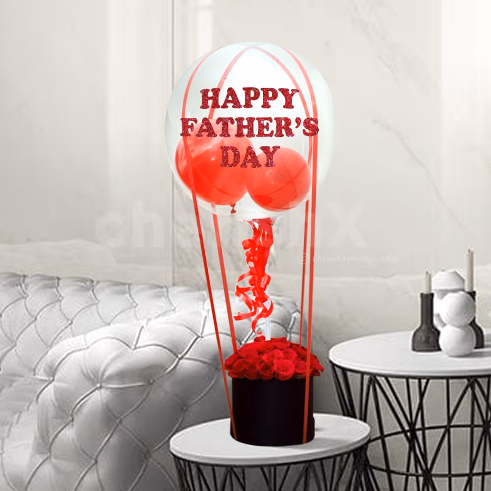 "Ever seen a hot air balloon? Isn't it amazing and fascinating to say the least? Well, that's why we have crafted perfectly and exclusively for you a miniature version of it. This gift is perfectly suited to surprise your DAD this father's day! This visually appealing present consists of 1 bucket of resplendent, blooming and fragrant roses, in a deep red color! The other component of this gift is one customized helium see- through balloon filled with 2 red heart balloons. A treat to the eyes! What's more, this surprise can be delivered to an address of your choice, anywhere in Delhi-NCR. so you can get it directly delivered to your daddy dearest!
