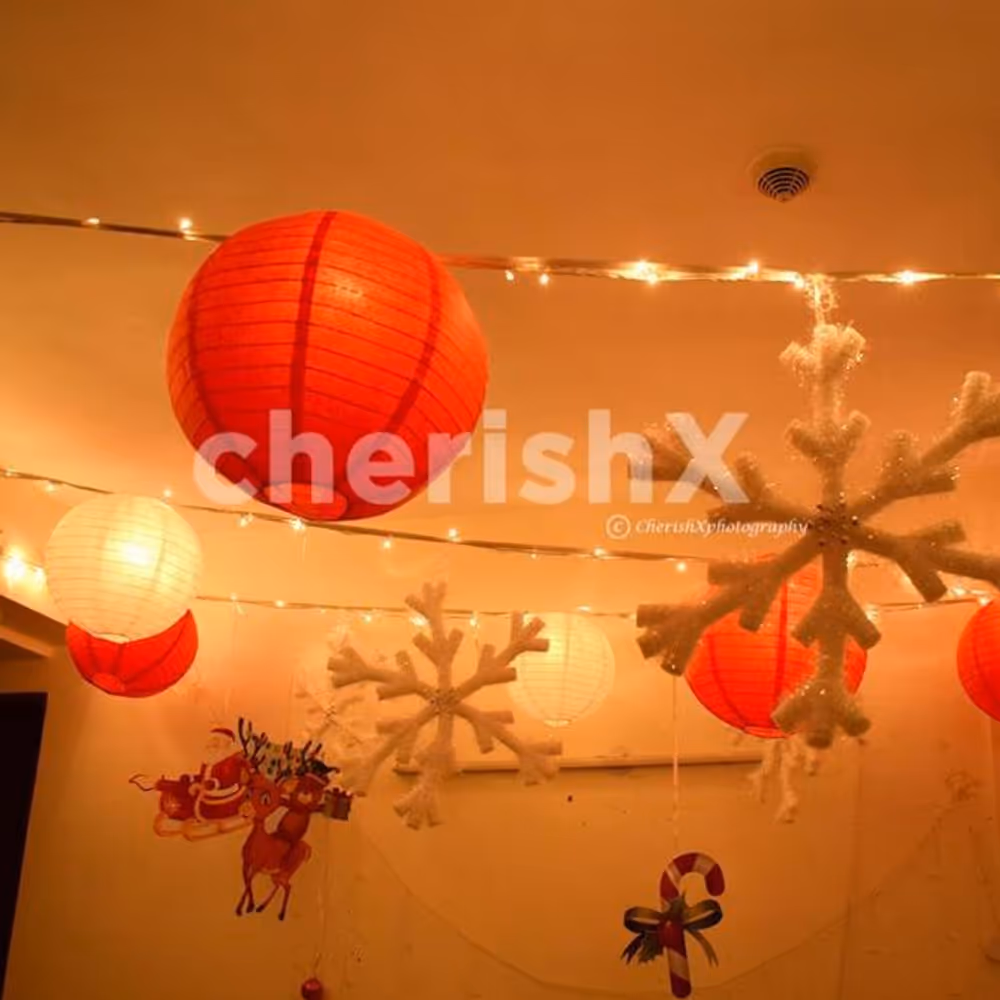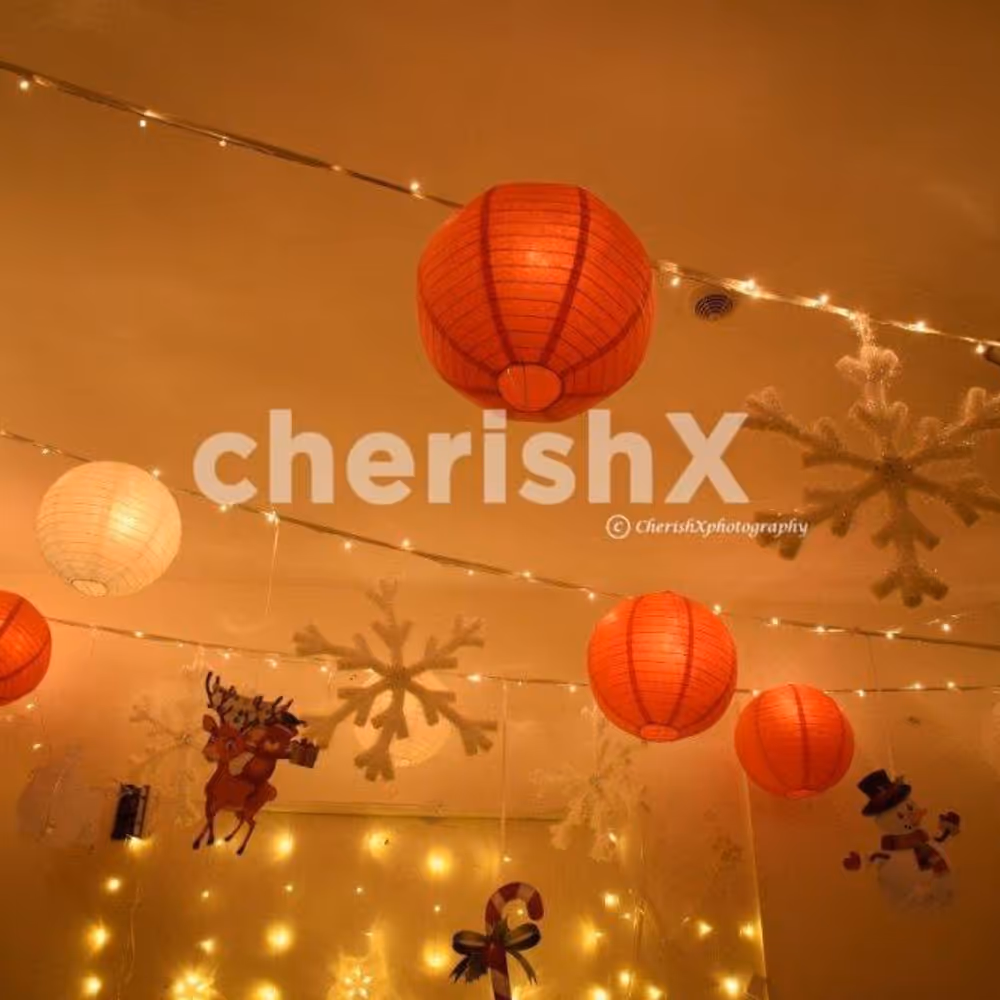 The Christmas holiday season is a special time of the year, filled with holiday decorations, hot chocolate, and plum cake. CherishX’s dreamy Christmas Decor is sure to make your house look cozy and prepare it for the flawless Christmas evening. The bright and elegant red and white lanterns along with like wintery snowflakes make the perfect Christmas decorations transform your house into a winter wonderland. Along with this, we use LED fairy light strings to give the room the right lighting effect.