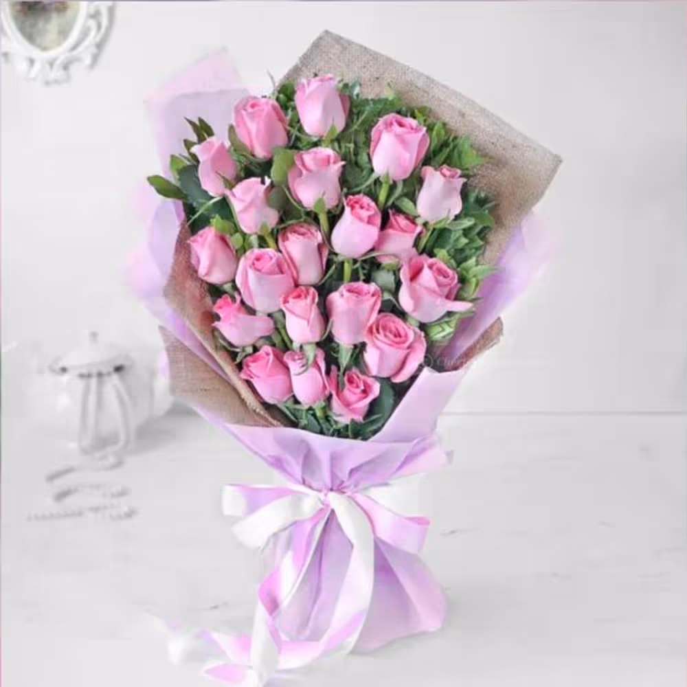 Bouquet of 20 Pretty Pink Roses picked fresh from the farm and delivered in a beautiful tissue packaging to your special recipient. Order these Bouquet of 20 Pretty Pink Roses a simple yet romantic gesture to your love ones delivered anywhere in Delhi, Gurgaon, Noida, NCR, Hyderabad, Bangalore, Jaipur.