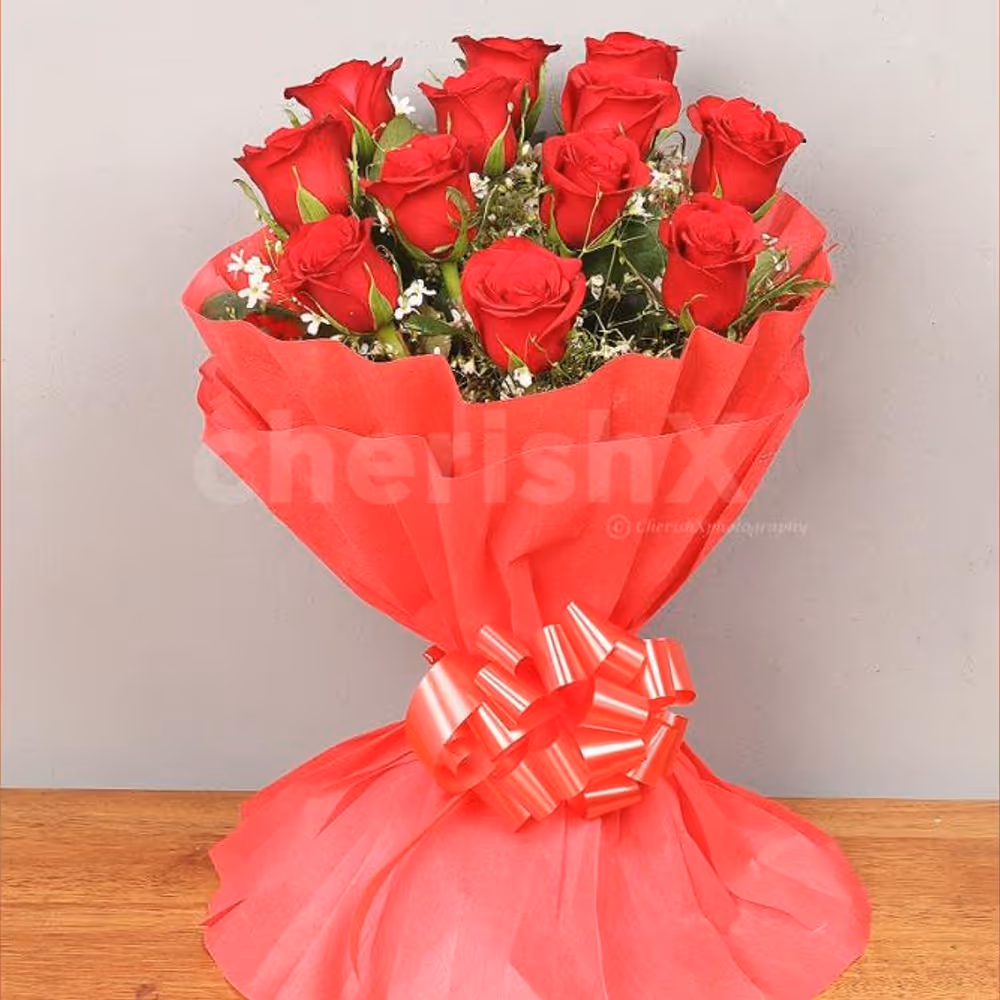 CherishX 12 Red Roses in Red Color paper Bouquet is picked fresh from the farm and delivered in a beautiful package to your special recipient. Our 12 Red Roses in Red color paper Bouquet is a classic but simple romantic gesture that will make them fall head over heels.