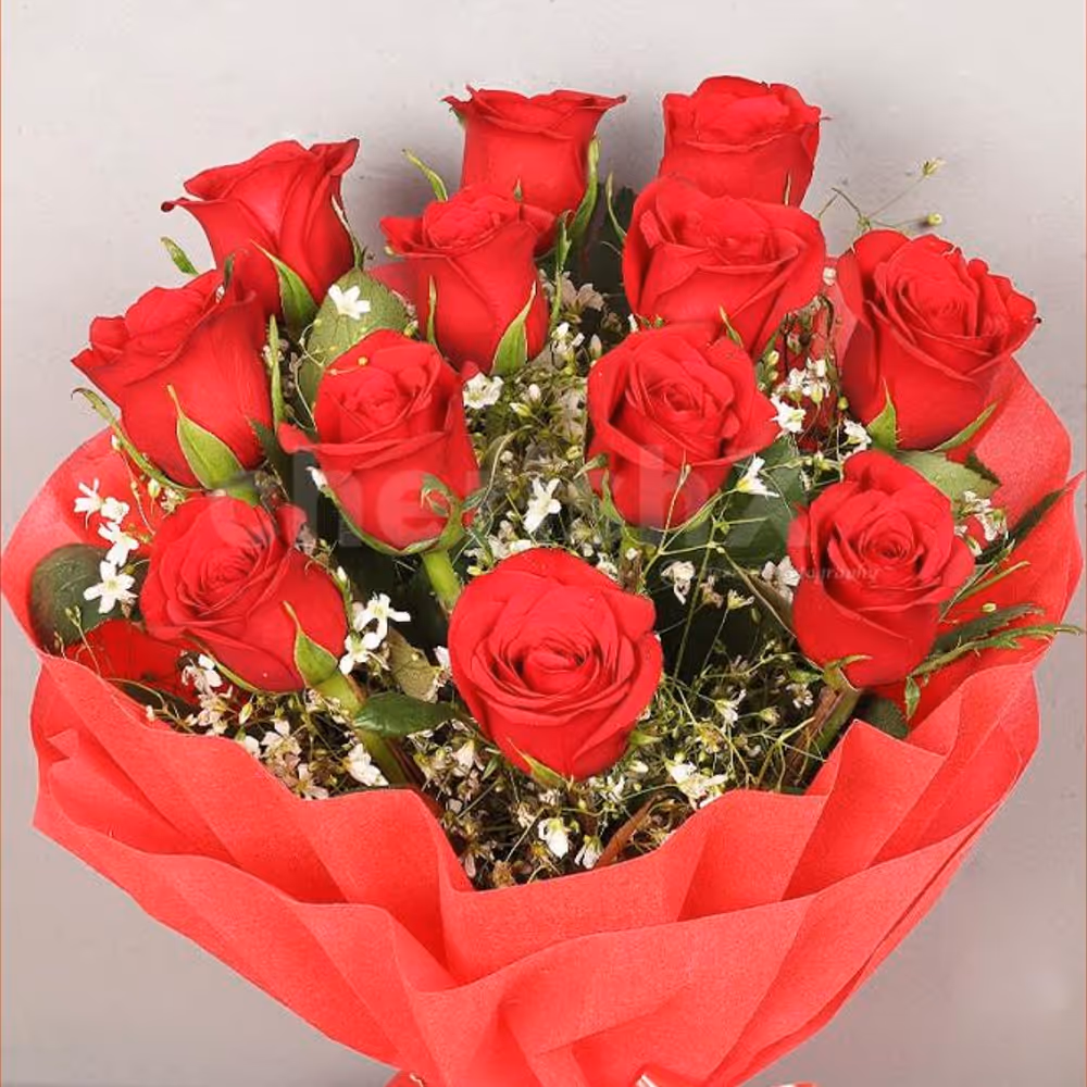 A bouquet made up of 12 fresh fragrant red roses wrapped in a red paper sheet