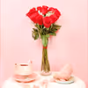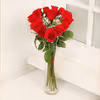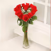• A bouquet made up of 15 fresh fragrant red roses wrapped in a glass vase
