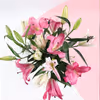 A bouquet made up of fresh fragrant 6 pink and white lilies in cylindrical glass vase bouquet