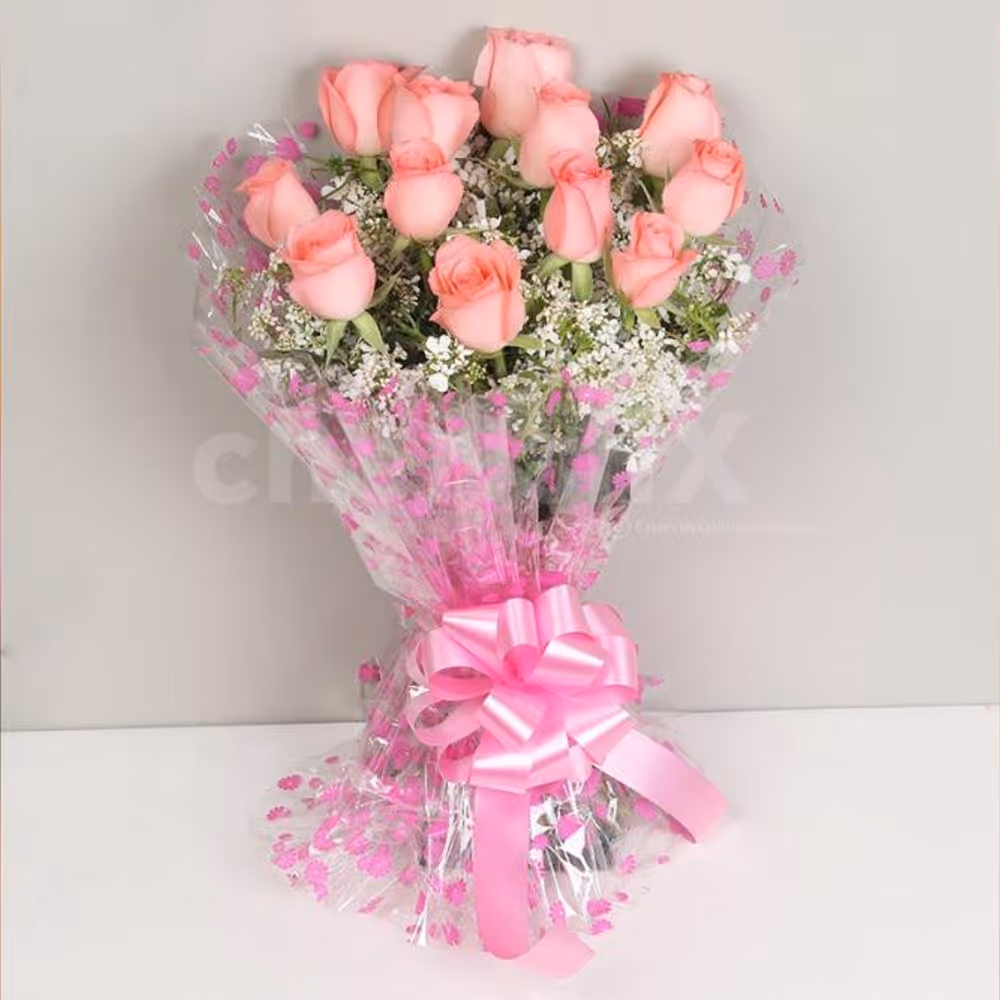 CherishX Pink bouquet is picked fresh from the farm and delivered in a beautiful cellophane packaging to your special recipient. Order 12 Pink Roses with a 12'' White Teddy delicious Kitkat Cake combo for a simple yet romantic gesture to your love ones delivered anywhere in Delhi, Gurgaon, Noida, NCR, Bangalore, Hyderabad, Jaipur.
