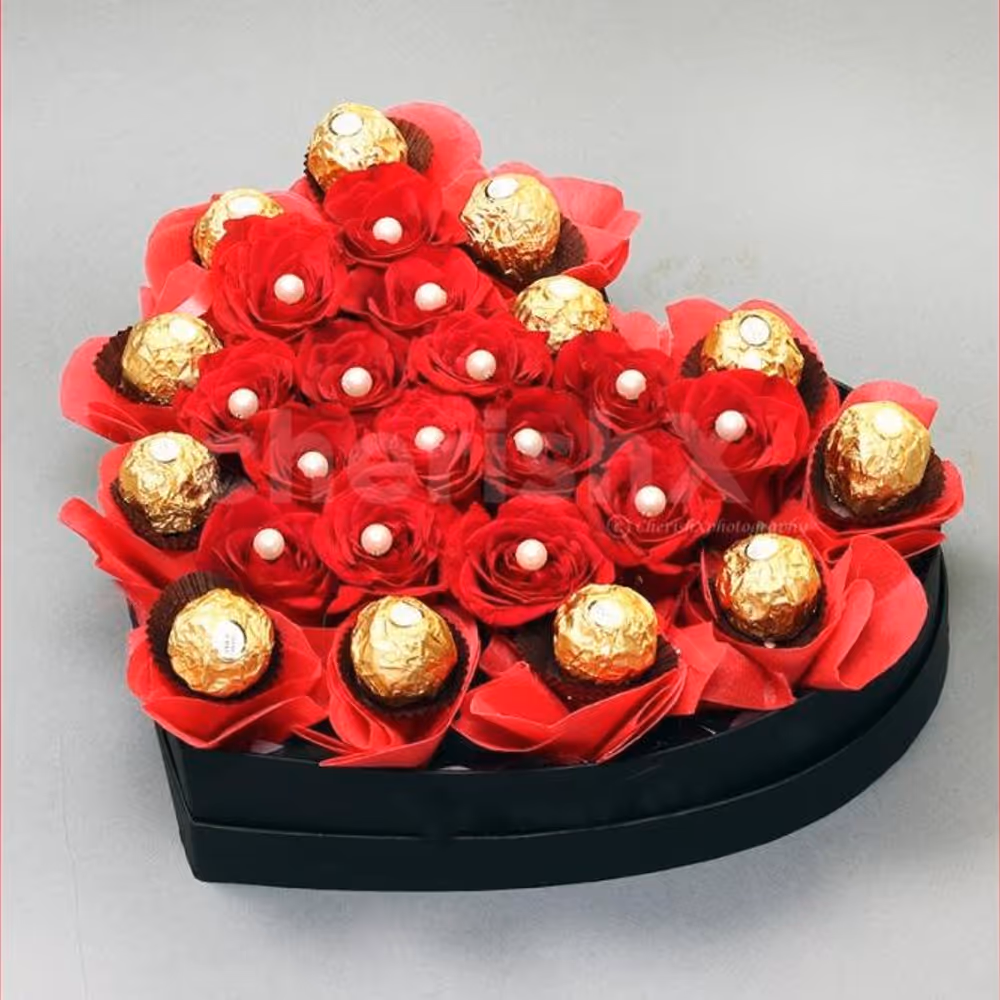 • A bouquet made up of 12 fresh & fragrant red roses in Heart Shaped Arrangement with 12 Ferrero Rocher.