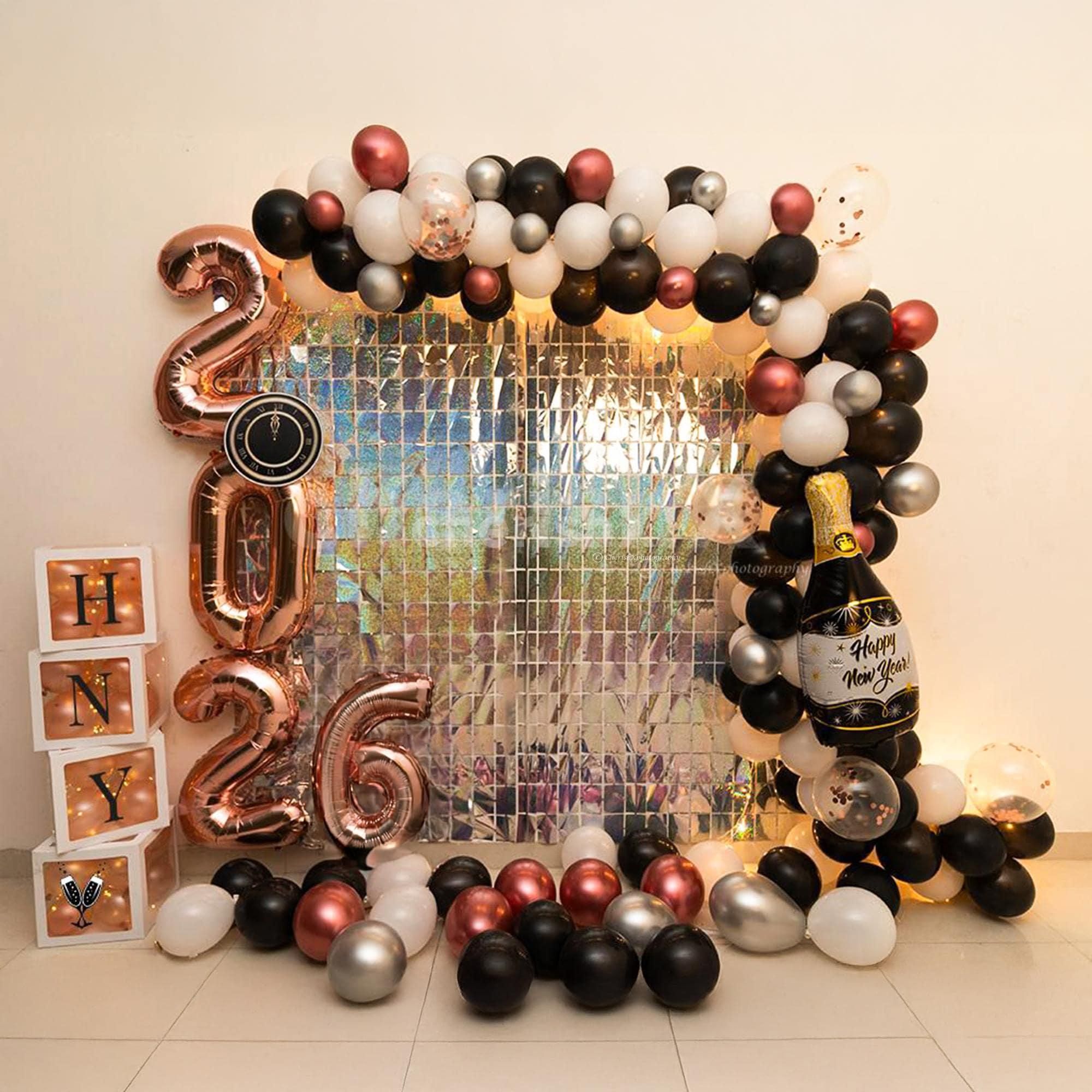 4 Transparent boxes filled with 20 rosegold metallic and silver chrome balloons along with HNY and glass stickers