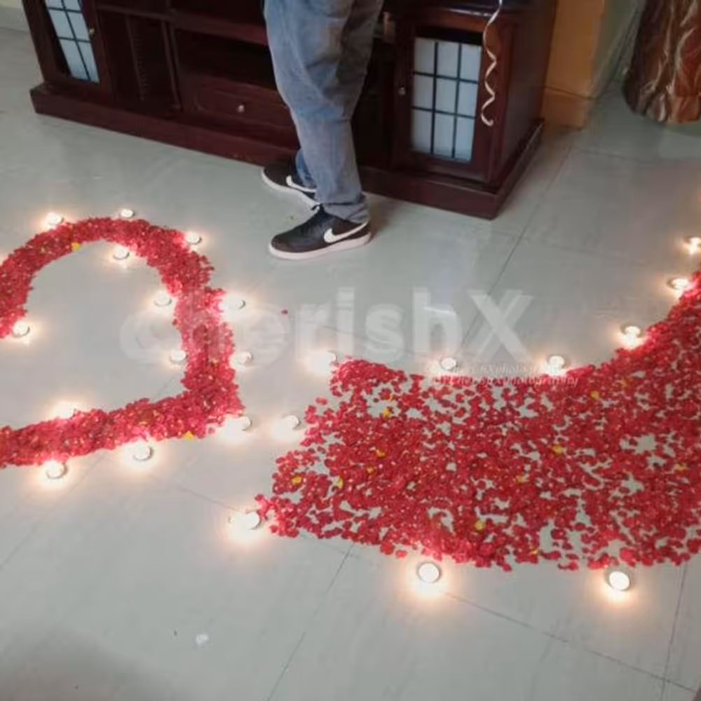 Get a Romantic Set up with Candles and Balloons to surprise your special one on Birthdays, Anniversary or First Night! The Decoration is filled with beautiful red balloons, candles and rose petals to give a romantic vibe to your place!