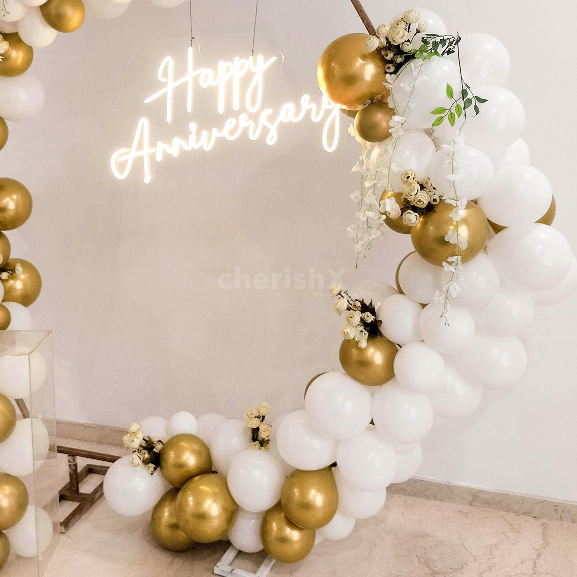 A beautiful arch of 150 balloons of colors 130 White Latex and 20 Golden Chrome balloons decorated with artificial flowers (color as per availability).