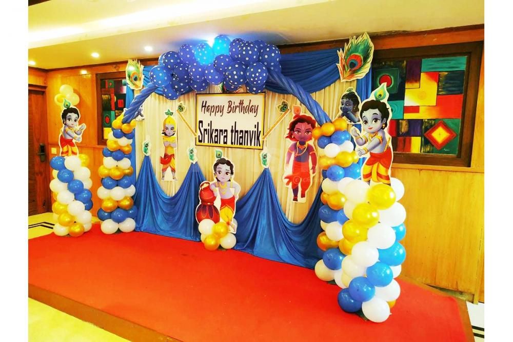 Plan your kid's birthday in the most special way with this Elegant Krishna Theme Banquet Hall Decoration. Embrace the Prince Like feeling for your child and let him enjoy the overall decoration!