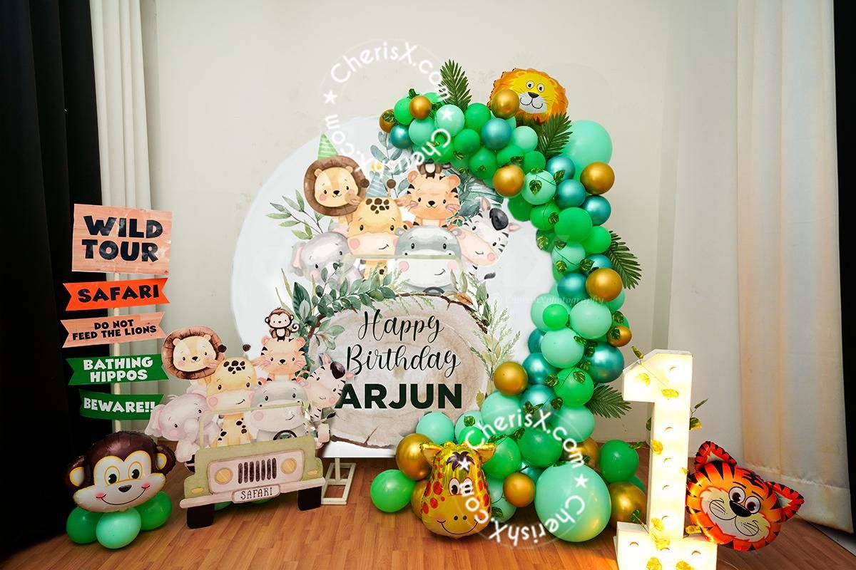 If you order it, you will get a Ring Stand, a Jungle Theme customized flex backdrop, a Jungle theme balloon arch of 200 balloons of colour 60 green pastels, 60 dark green latex, 60 light green latex, 10 green chrome, and 10 golden chrome balloons decorated with 2 money plant bells and 4 artificial leaves, 2 Green pastel bladder balloons (24 inches), 4 Animal face foil balloons (tiger, monkey, lion, and giraffe), a Jungle theme direction board (placed with a base stand and a PVC pipe), a Jungle Safari Car sun board cutout (3ftx3ft) and a pretty Digit LED decorated with money plant bell.