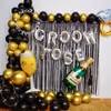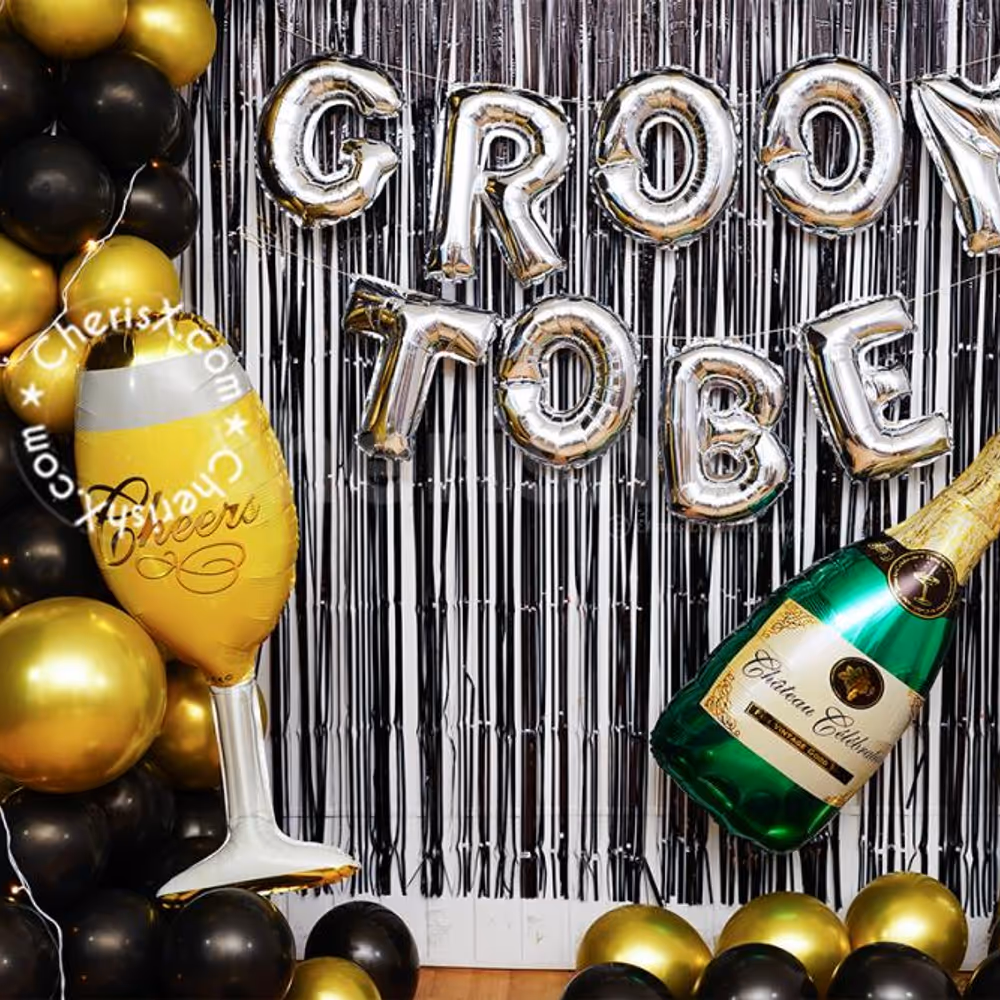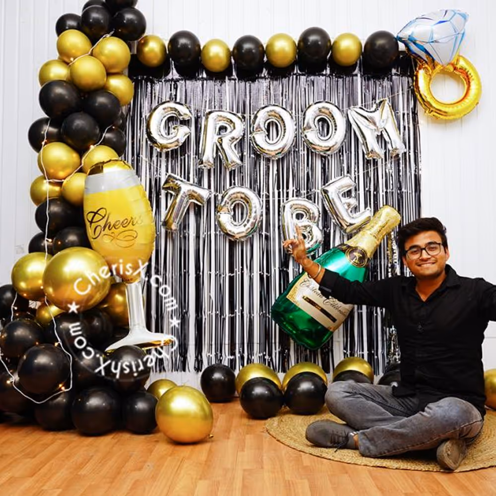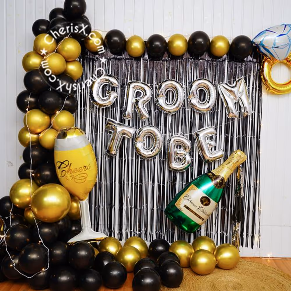The theme incudes 2 Black foil frill , Groom To Be foil balloons a beautiful arch of 100 balloons of colour 50 Black latex and 50 Golden chrome balloons decorated with 1 Silver 4D Balloon, 1 Cheers Glass foil balloon (36 inch), 1 Ring foil balloon (32 inch), 1 Champiane bottle foil balloon with 3 Tassel and 1 Pixel Light.