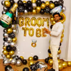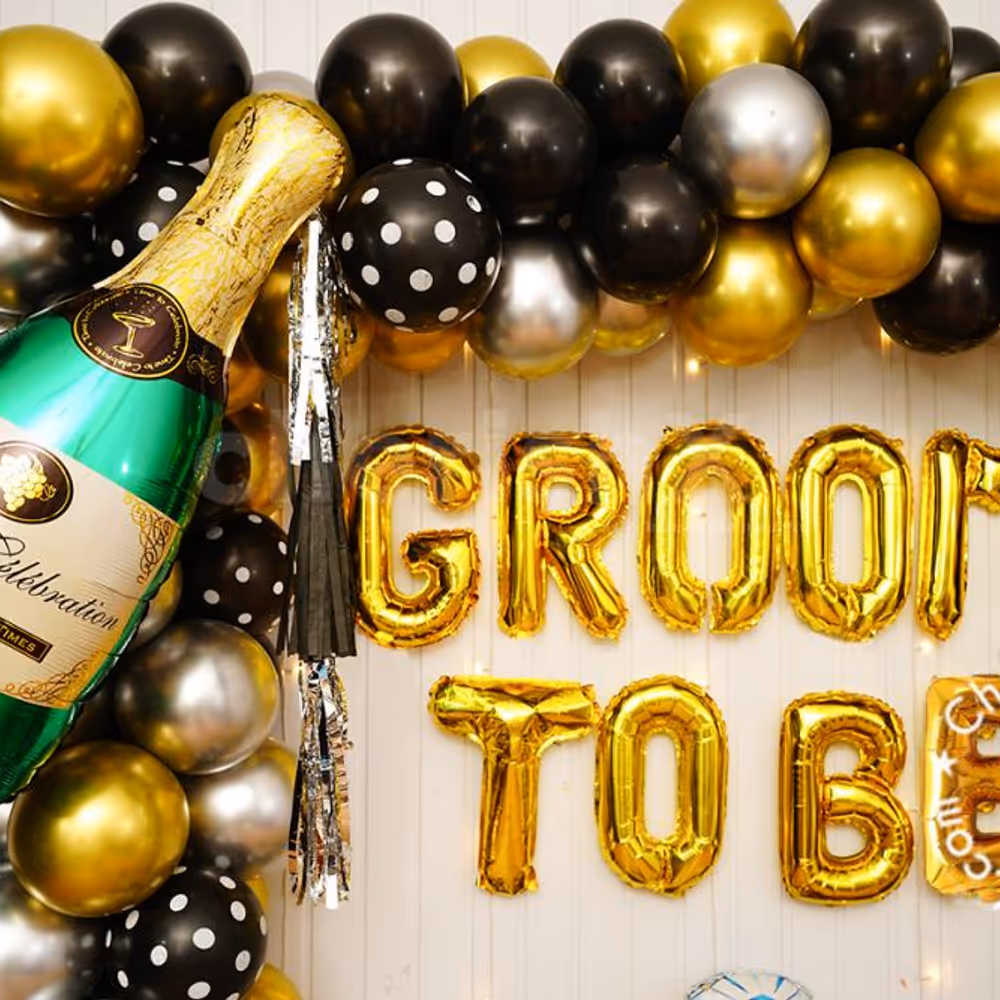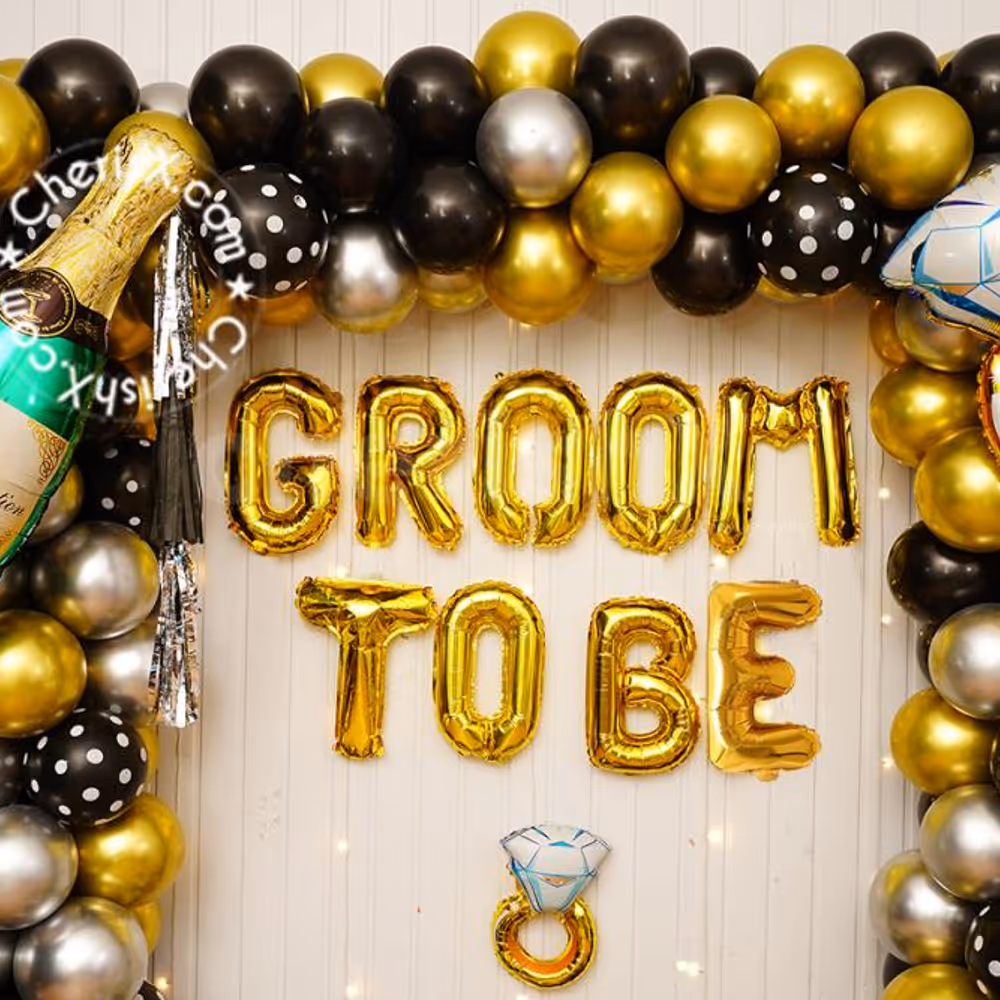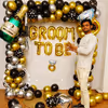 The theme includes Groom To Be foil balloons a beautiful arch of 200 balloons of colour 50 Black latex, 50 Black Polka dot, 50 Silver chrome and 50 Golden chrome balloons decorated with Ring foil balloon, 1 Champagne bottle foil balloon with 3 Tassel and 1 Pixel Light.