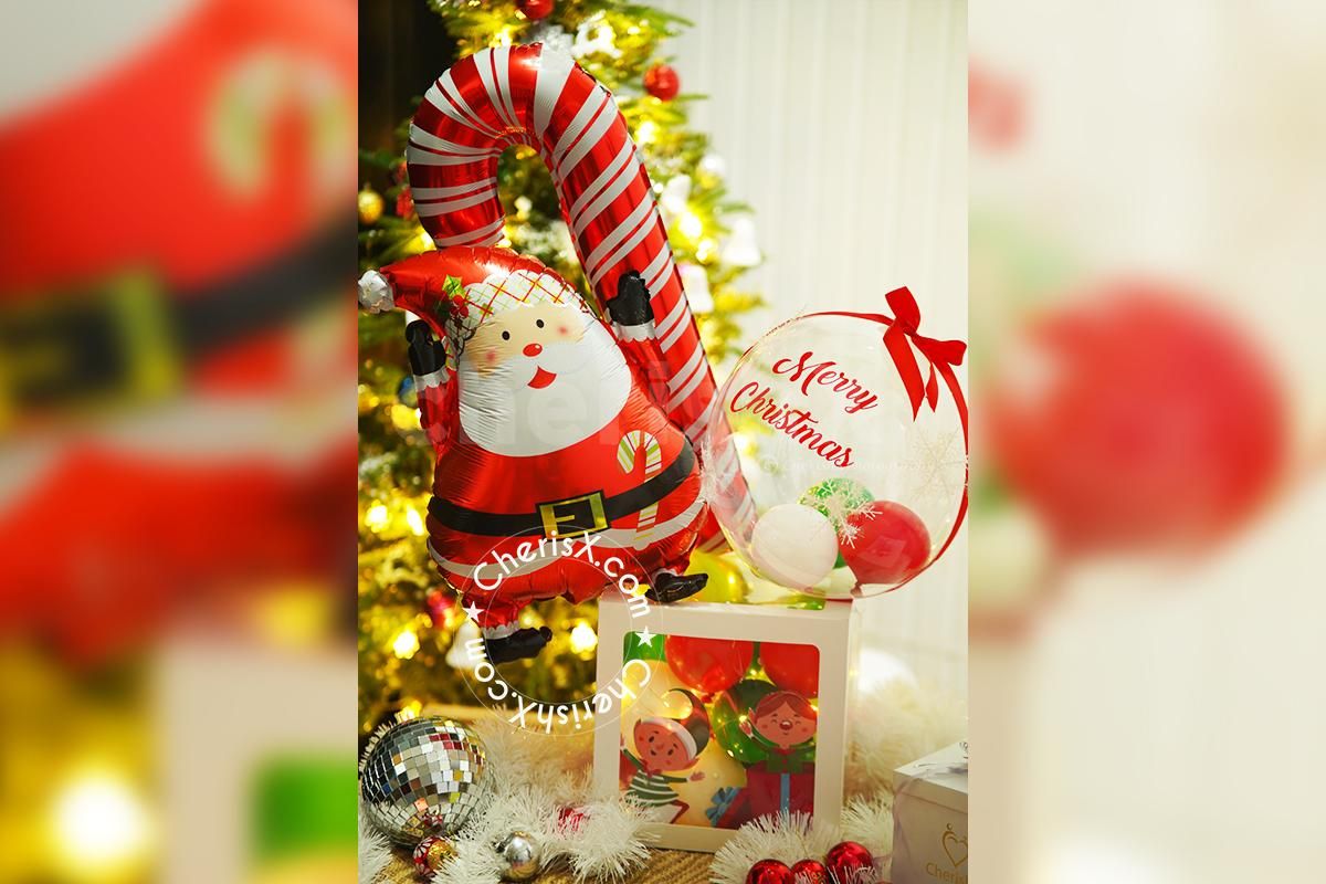 The bouquet includes 1 Bubble balloon filled with red, green and white balloons with a Christmas wish on it, tied with a red ribbon, 1 Transparent Box filled with 6 Teddy shape chocolates and red, green and white latex balloons with battery lights, 1 Santa Foil Balloon, and 1 Candy Cane foil balloon. This unique and eye-catching bouquet will surely delight family and friends alike, with its bright colours, bold patterns and festive designs.