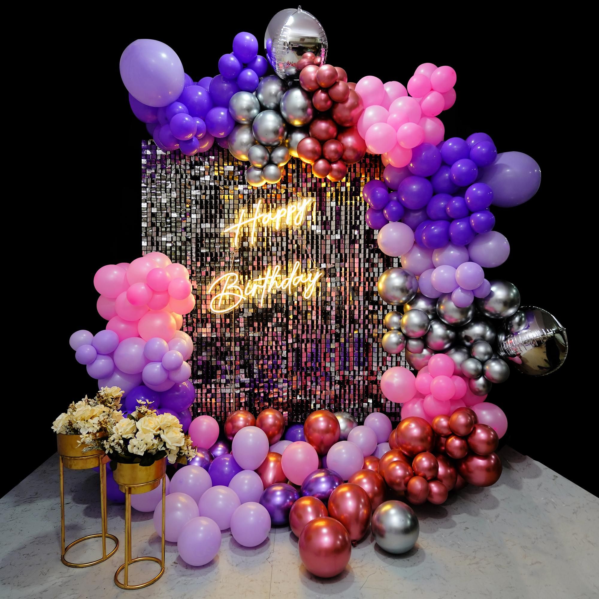 Arch of 300 balloons of colour 60 Rose Gold Chrome, 60 Silver chrome, 60 Purple latex, 60 Purple pastel, 60 Pink Latex