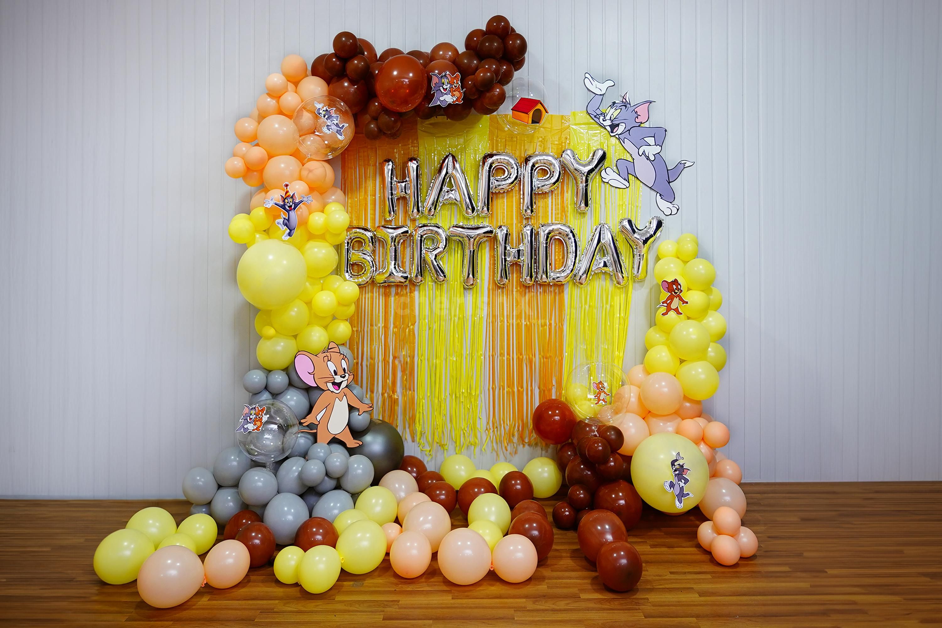 Calling all Tom and Jerry fans! It's time to turn your child's birthday into an extraordinary adventure with our enchanting Tom and Jerry Decoration. Picture your little ones stepping into a world of fun and laughter, surrounded by delightful surprises. Our party setup boasts a dazzling Silver Happy Birthday Foil Balloon that sets the perfect celebratory tone. With a pastel yellow and orange frill curtain backdrop, the ambience is sure to be filled with excitement and joy. The real showstopper is our exquisite arch of balloons in shades of grey, yellow pastels, peach pastels, and brown latex, framing the party in a burst of vibrant colours. Two big macron balloons add a touch of grandeur, making your child's special day even more spectacular.