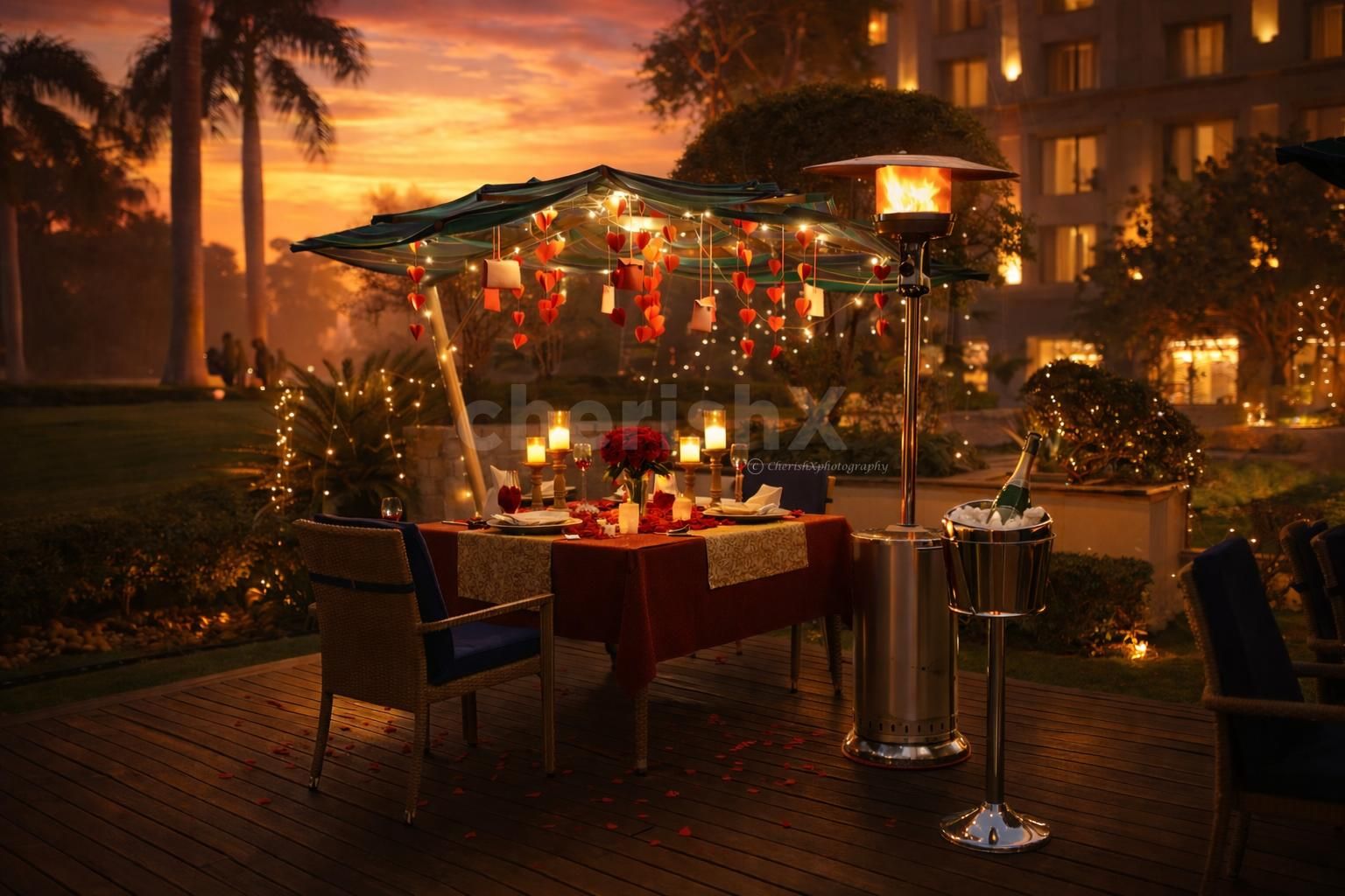 Celebrate love this Valentine’s Day with an exclusive candlelight dining experience at The Grand, designed to feel intimate, romantic, and unforgettable. Set under a beautifully decorated umbrella adorned with paper hearts and love letters, this enchanting table-for-two is surrounded by soft candlelight, warm sunset hues, and serene garden views.