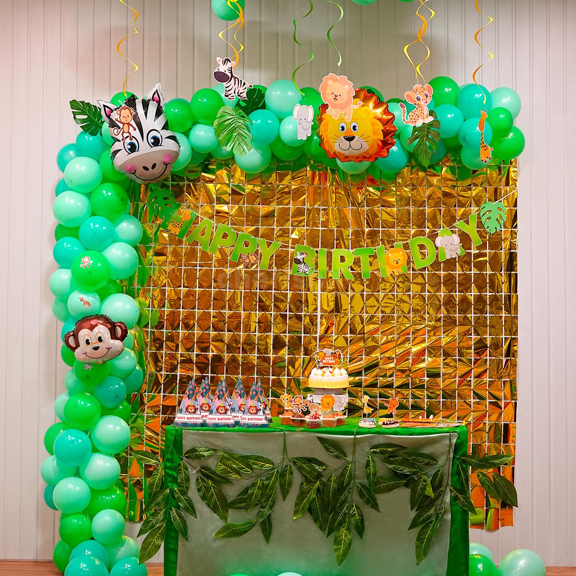 Jungle Theme Birthday Pack(Happy Birthday Bunting, 10 Cone caps, 10 eye masks, swirls with characters, 6 cupcake toppers, 1 cake topper, 6 animal stickers)