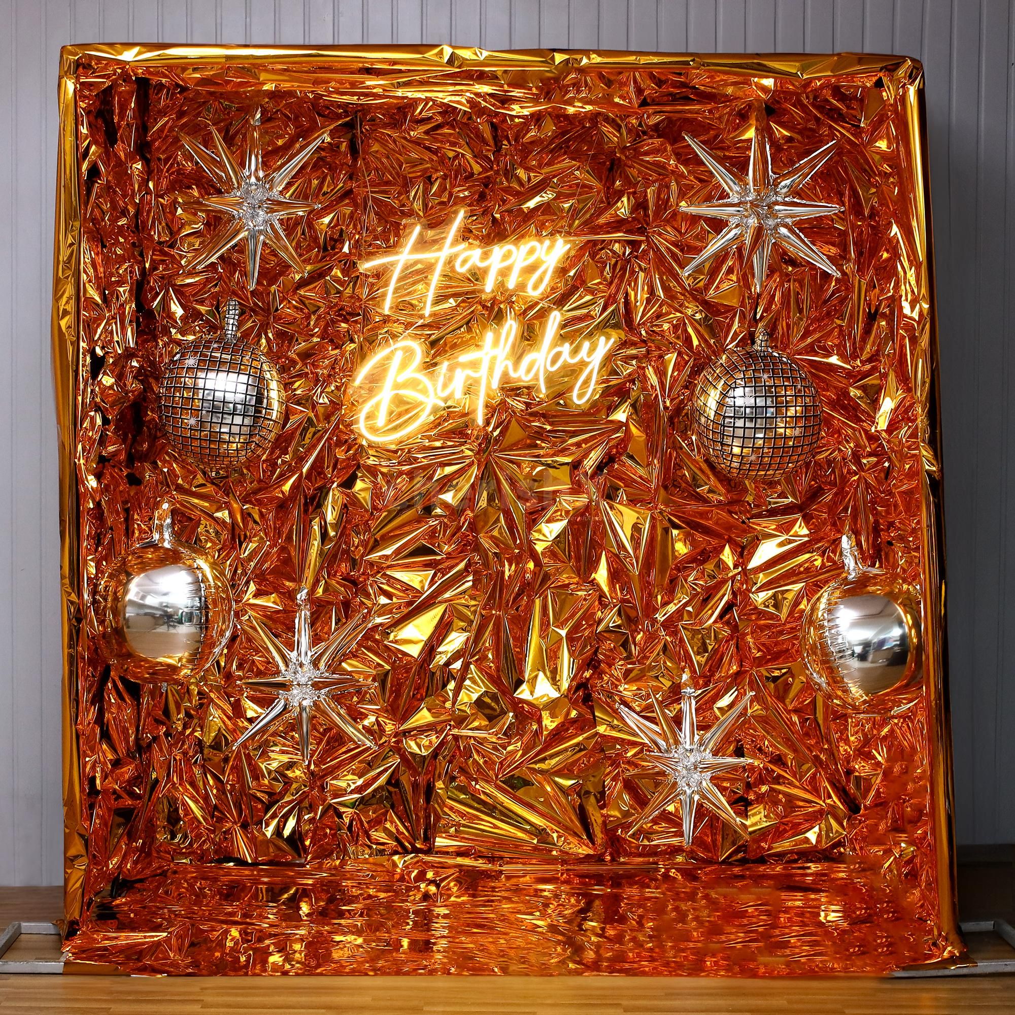 A 7 ft golden backdrop will be put on a stand in the room for the birthday decoration. This backdrop adds bling to any dull room and it will surely make your guests excited. Along with the backdrop, there are 4 disco silver balls which will be hung on the front of the backdrop.