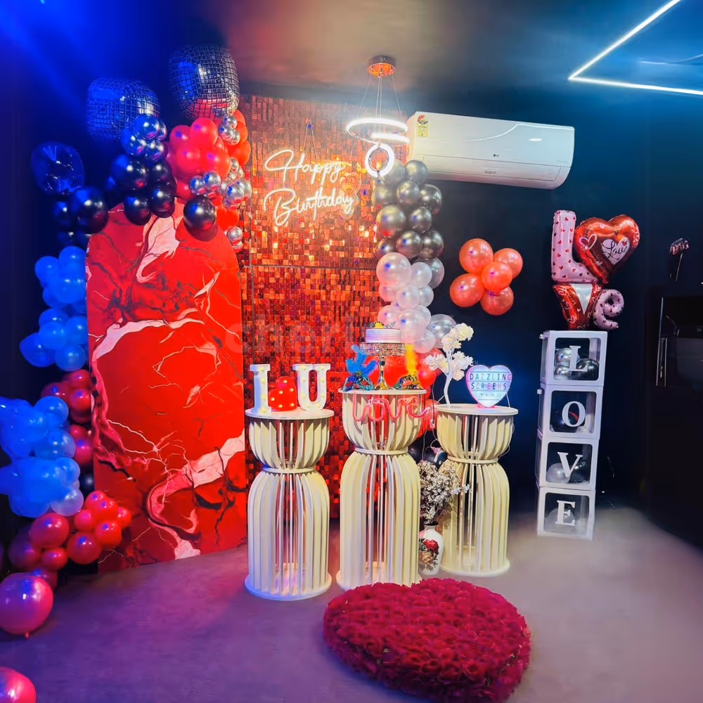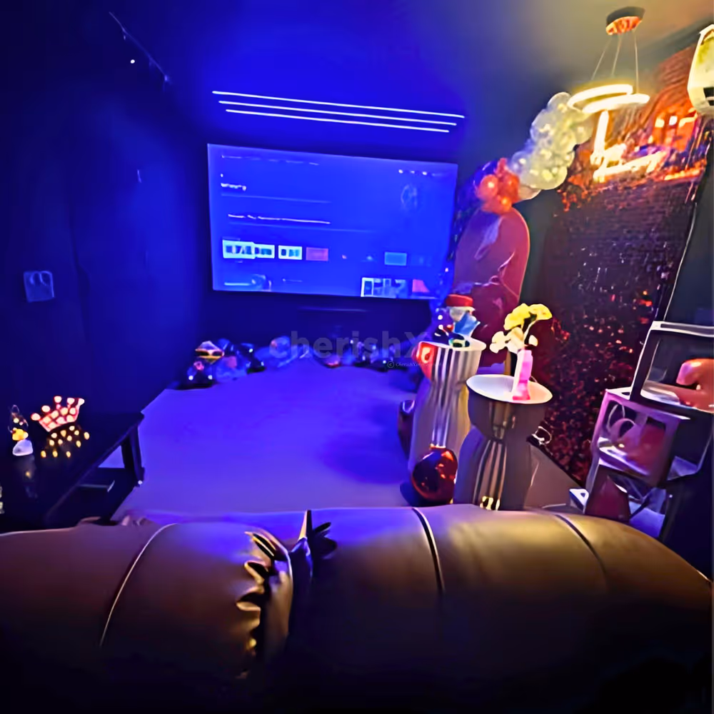 Thematic balloon & led decor: a beautifully decorated private lounge with elegant balloon arrangements and led lighting for a cozy, romantic, or celebratory ambiance.