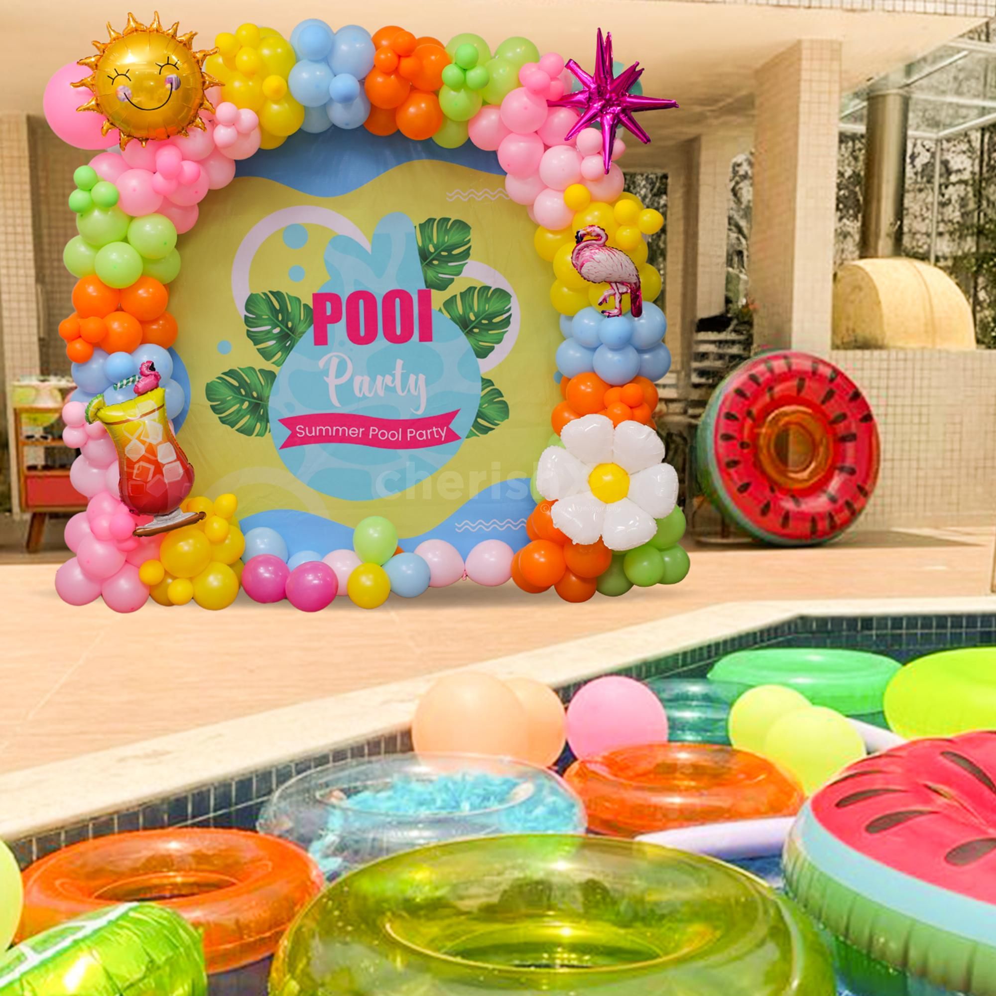 Colorful pool party background with tropical balloon settings