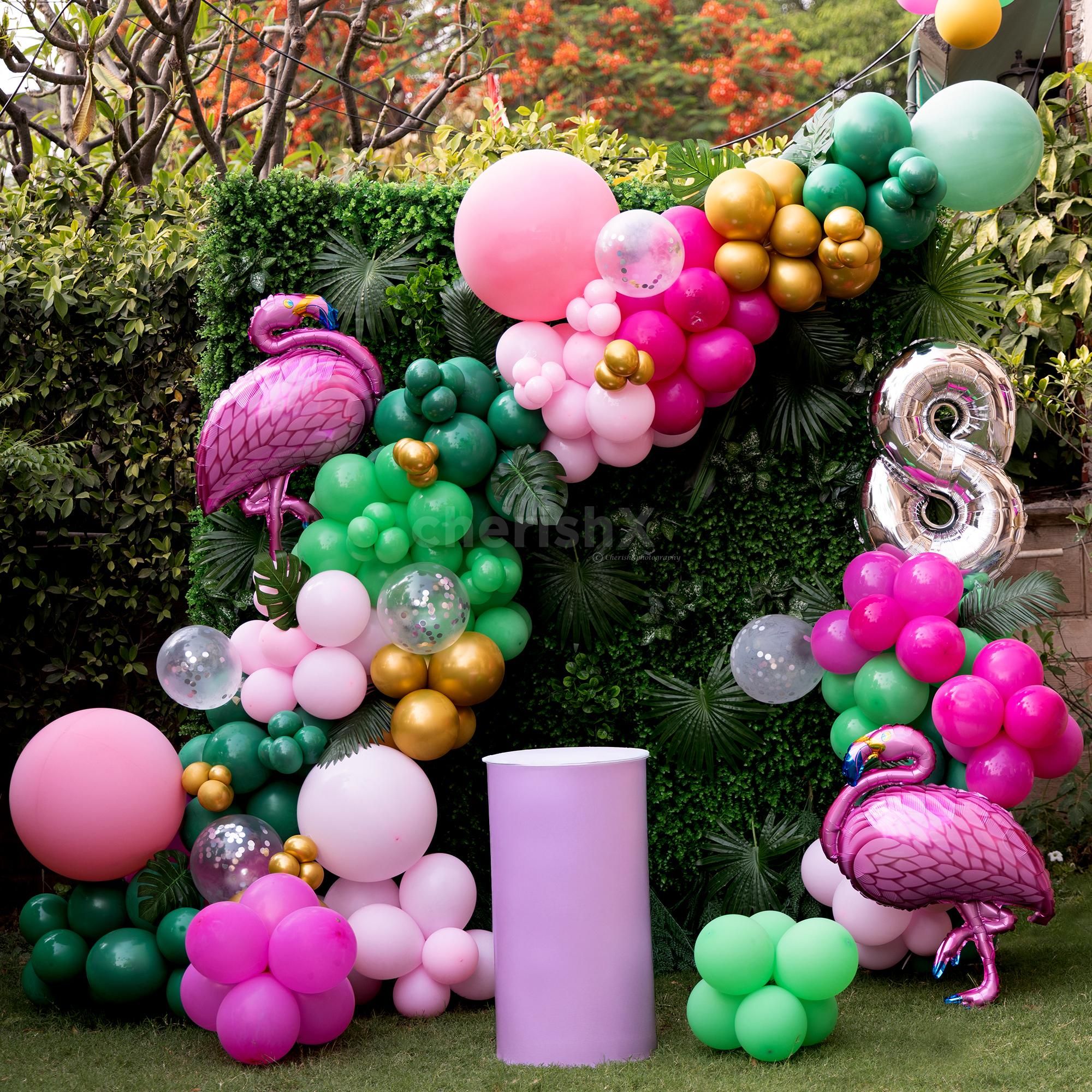 Arch of 200 Balloons, Light Green Latex, Dark Green inside Black, Pastel Pink, Golden Chrome and Magenta Double Balloons