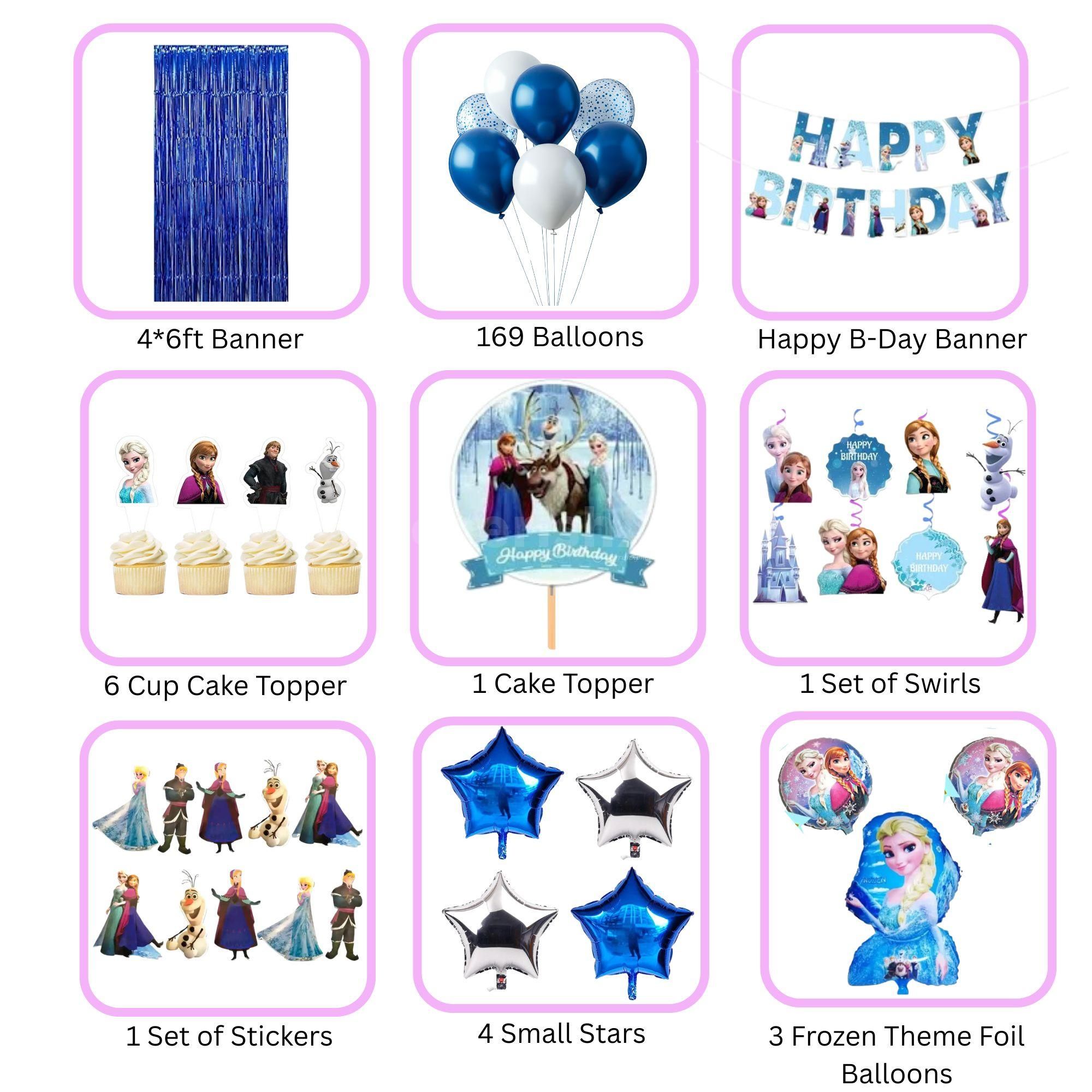 This isn’t just birthday decor — it’s a full-on Frozen celebration. The balloon arch features 80 latex balloons in dreamy shades of white, chrome blue, purple, pastel blue, and chrome light blue. Frozen stickers aren’t just stuck — they’re played with, traded, and shared with joy. Toppers glitter like magic, swirls dangle like candy spells, and foil stars float with that show-stealing sparkle. Dark blue frill curtains frame the space, while ceiling balloon bunches and free-floating balloons lift the mood. Every corner feels touched by Frozen magic — playful and charming. The shades of blue will fill the space with soothing effects - perfect for birthday joy.