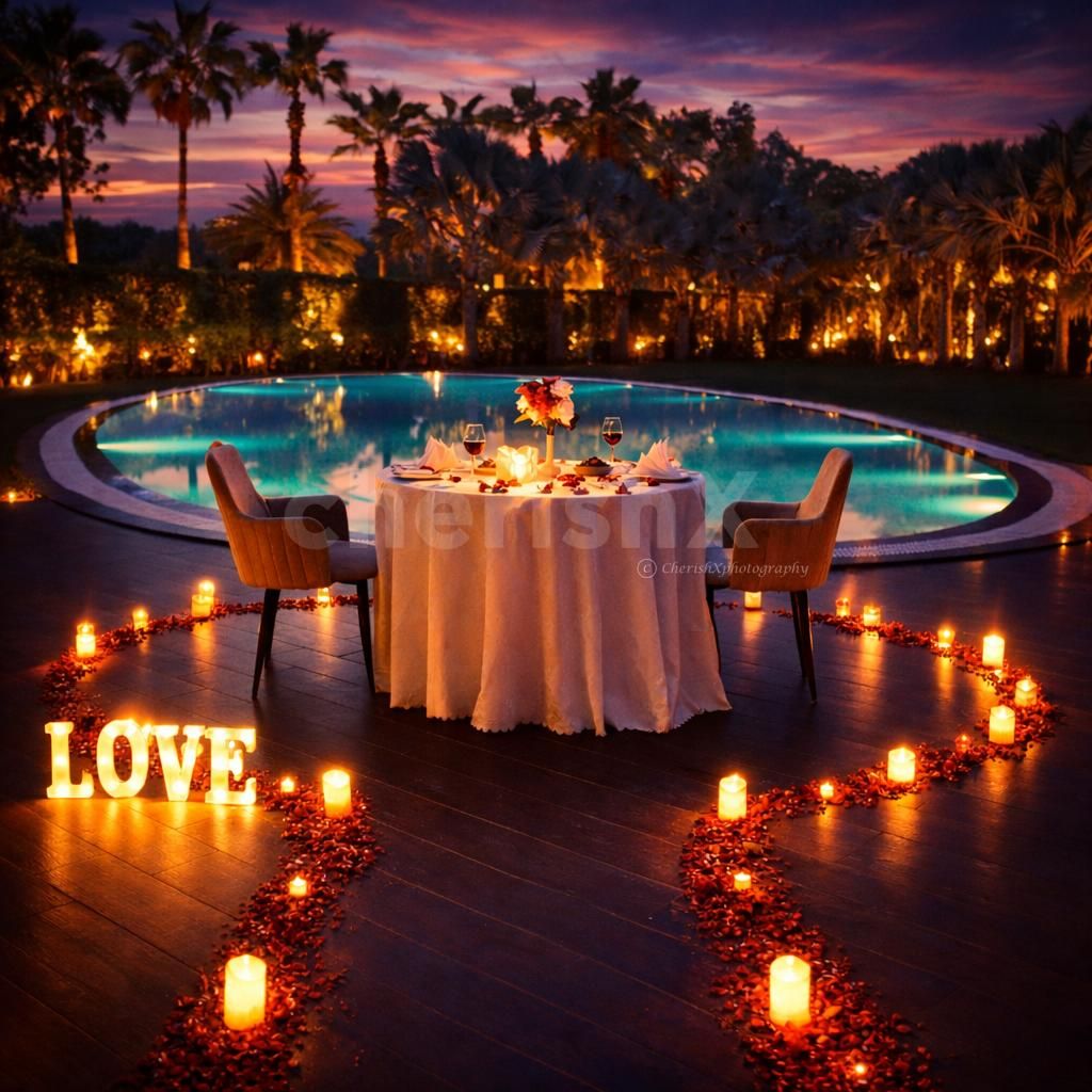 Decorated table with flower petals, LED candles, Love LED and rose petals passage