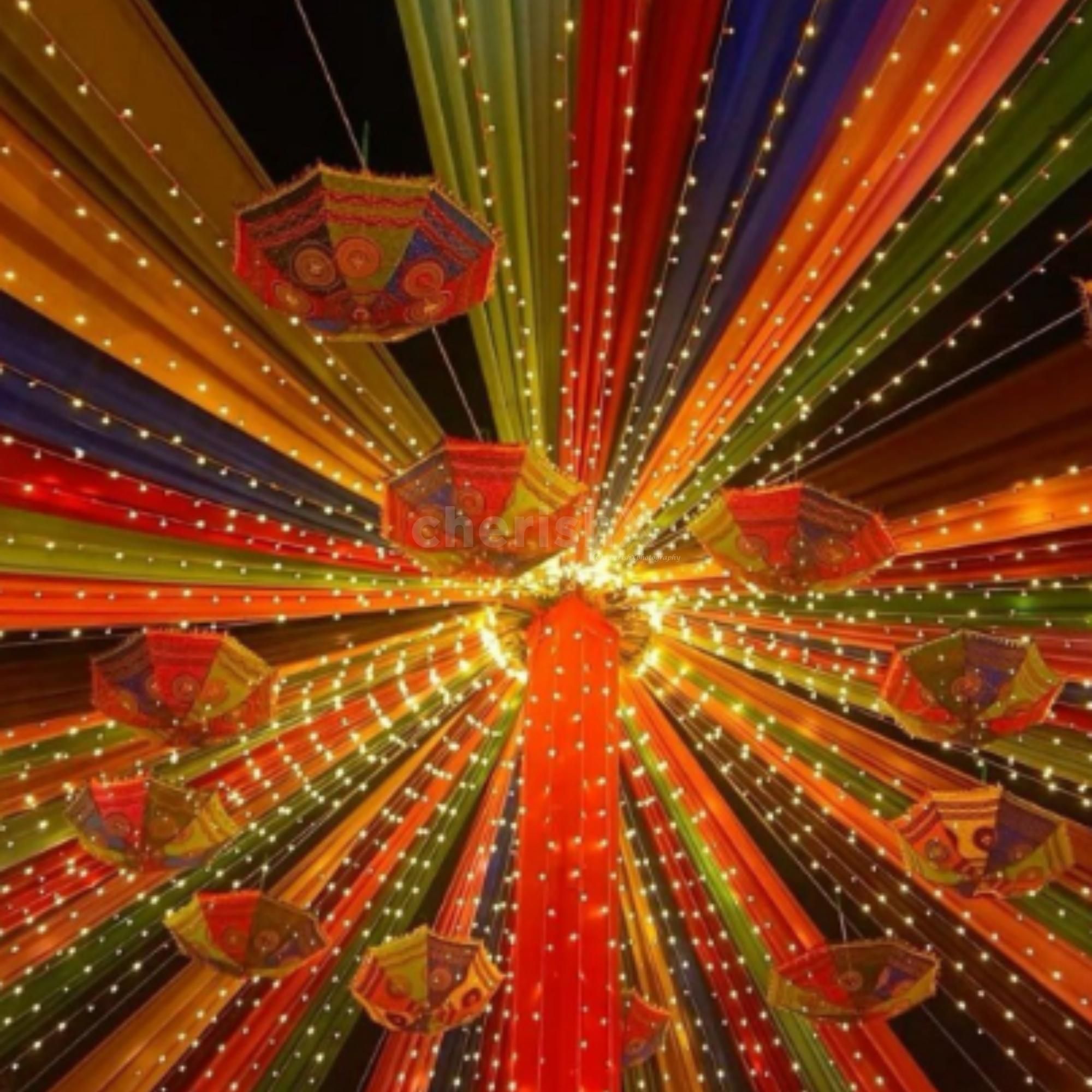 Festive Room Setup with Drapes, Lighting, and Ethnic Umbrellas