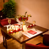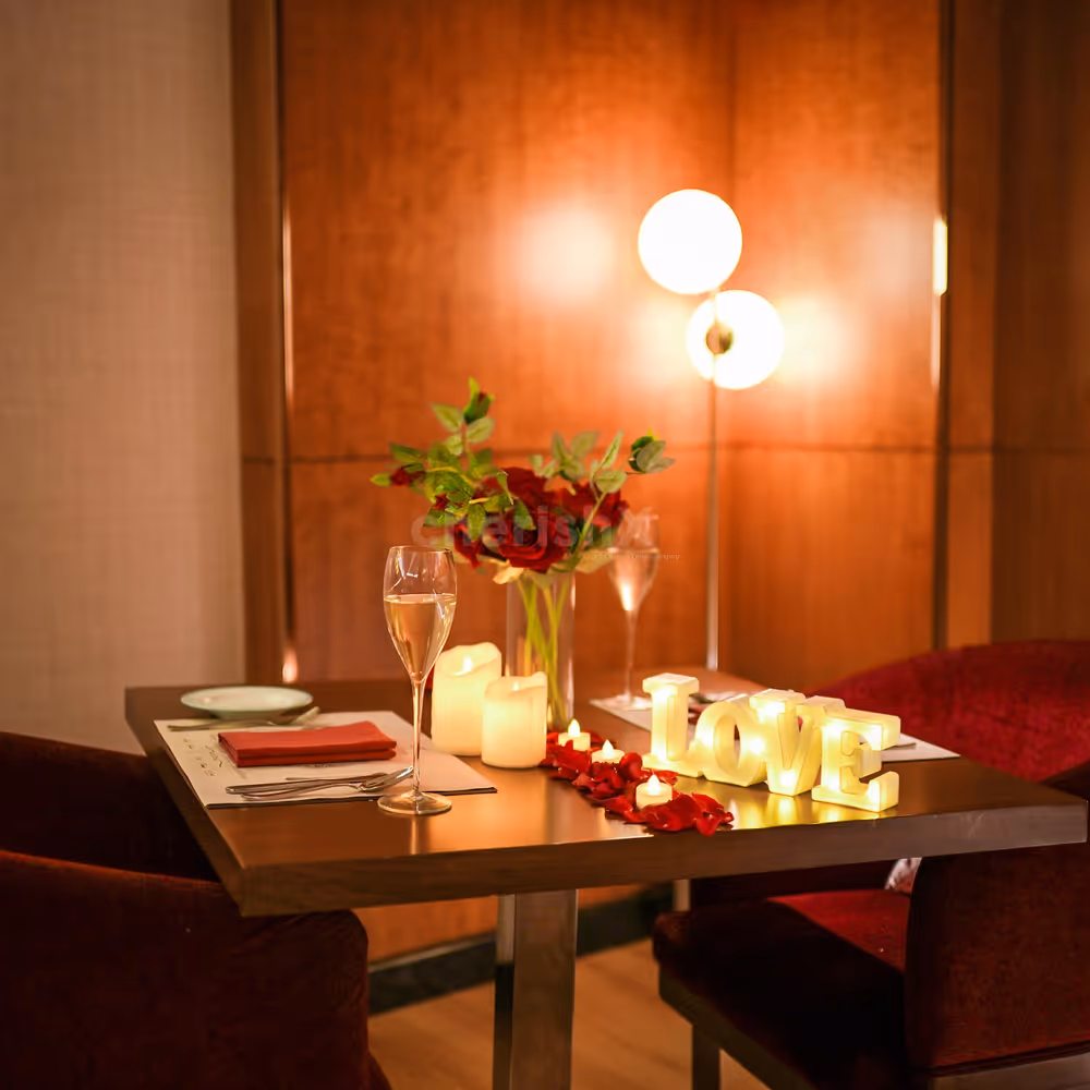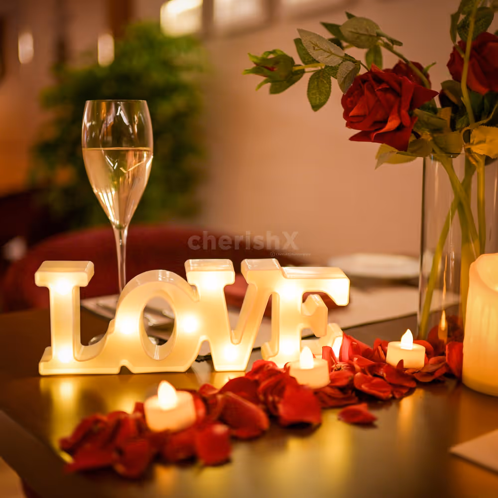 Decorated Table with LED Love, Rose petals and Candles for Dinner