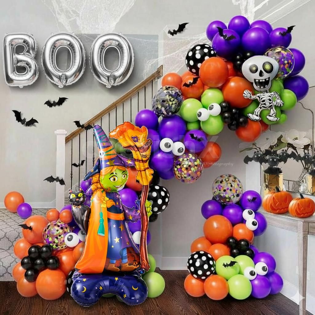 Halloween Balloon Backdrop with BOO Foil & Bat Cutouts