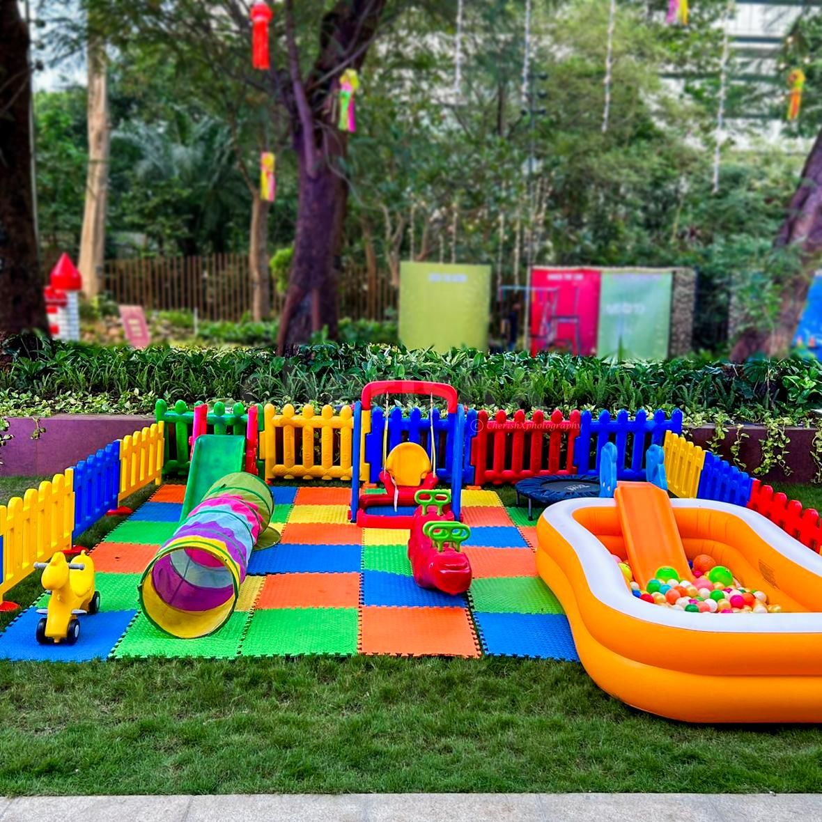 All-in-one play package featuring ballpit, trampoline, slide, swing and ride-ons for kids.