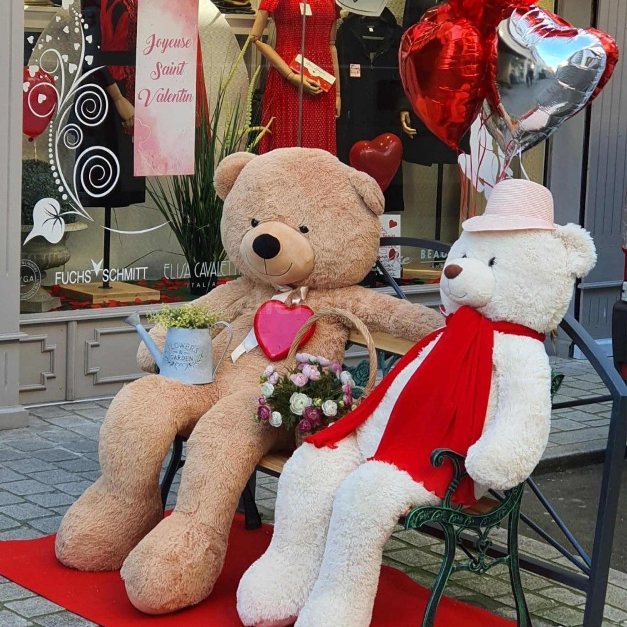 A teddy couple on chair with helium balloons