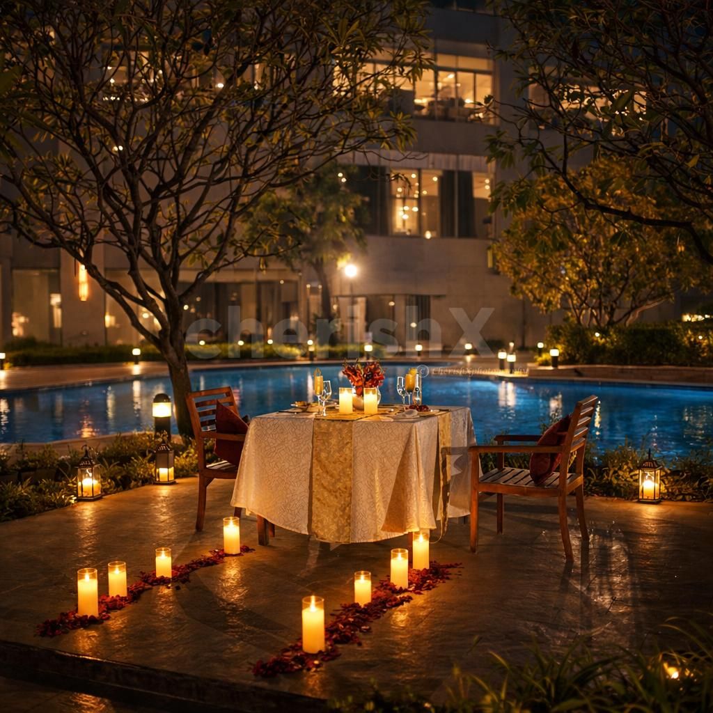 Unwind into a romantic evening with a pool-view garden open-air candlelight dinner, crafted for couples who love calm surroundings, soft lighting, and meaningful conversations. Set amidst lush greenery with serene views of the pool, this open-air dining experience feels intimate yet refreshingly spacious.