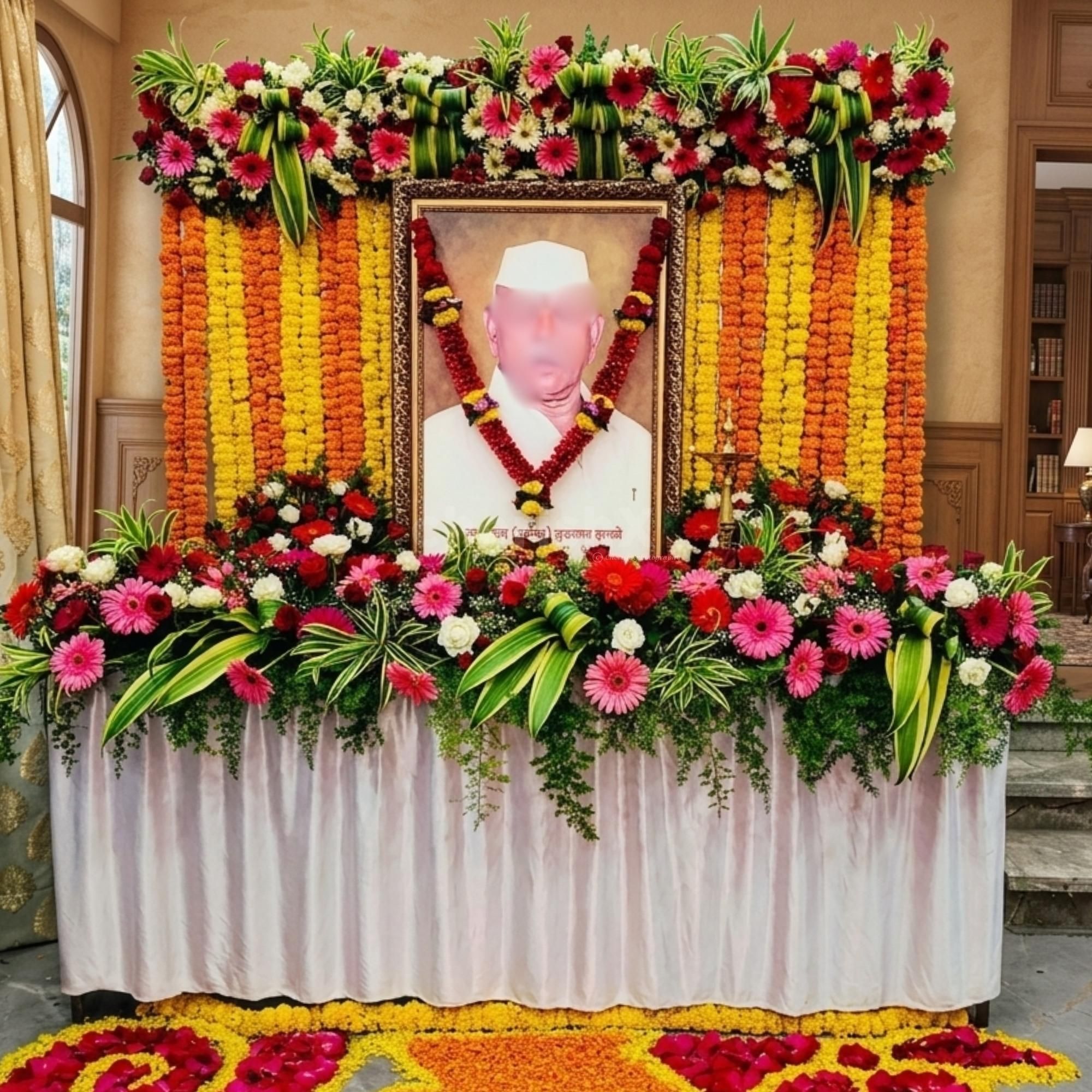 This Shanti Smaran decor is designed to create a peaceful and respectful space for remembrance. It also features a backdrop of a fresh flower, which the photo can be beautifully positioned against. There is also a decorated table with white cloth and flowers, creating a clean, relaxed appearance. The tribute is complete, with a flower garland added to the photo. This simple, minimalist setup helps create a serene atmosphere where family members and friends can gather and pray