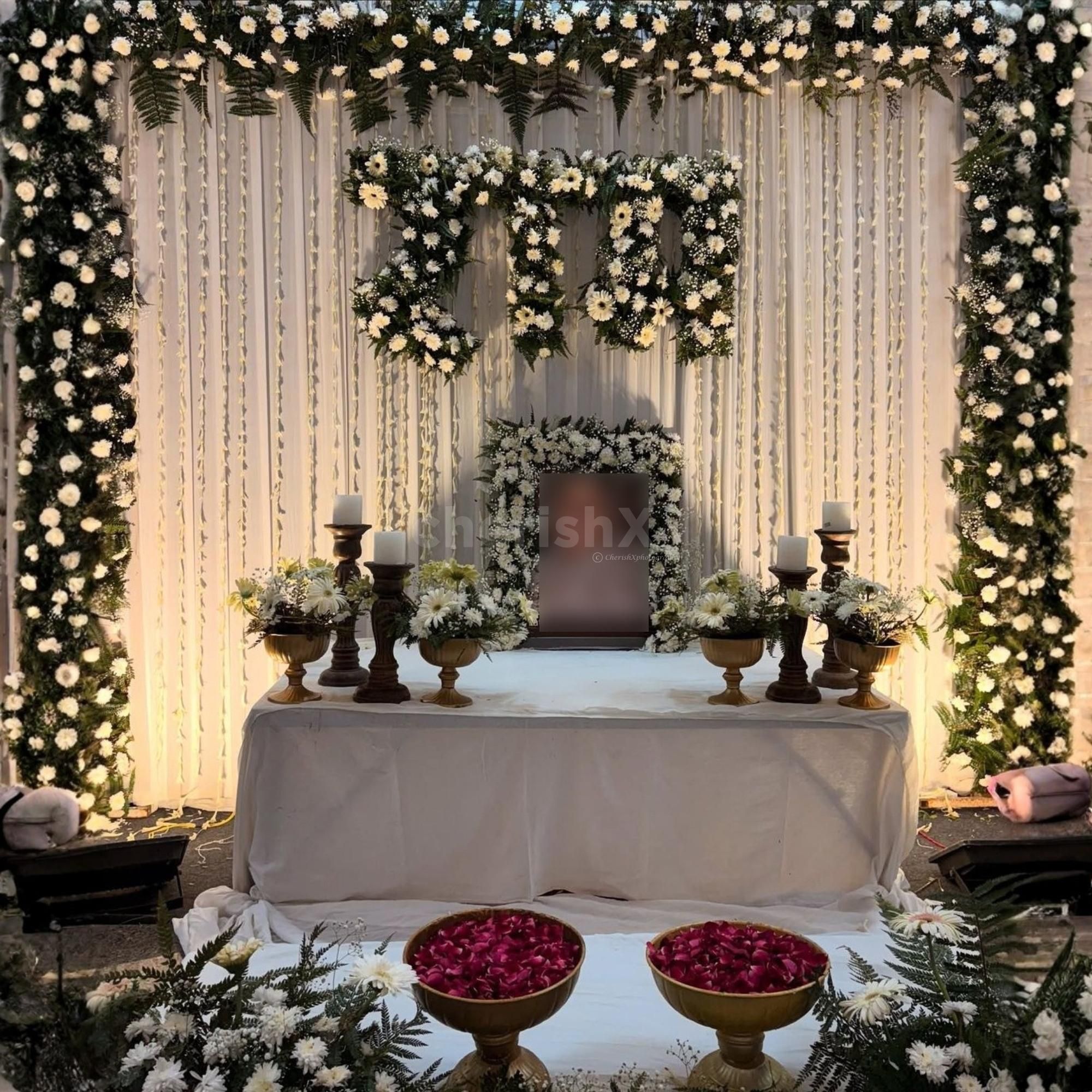 This heavenly remembrance decor creates a peaceful and respectful space to honor your loved one. It includes a beautiful flower backdrop with fresh green leaves and white flower arrangements. A photo frame is placed in the center, decorated with flowers as a tribute. Wooden candle stands, brass pots, and 2 lotus pots are added to complete the appearance. This plain, simple artistic design is meant to create a quiet, peaceful atmosphere so that family members and friends can assemble, pray, and reminisce together.