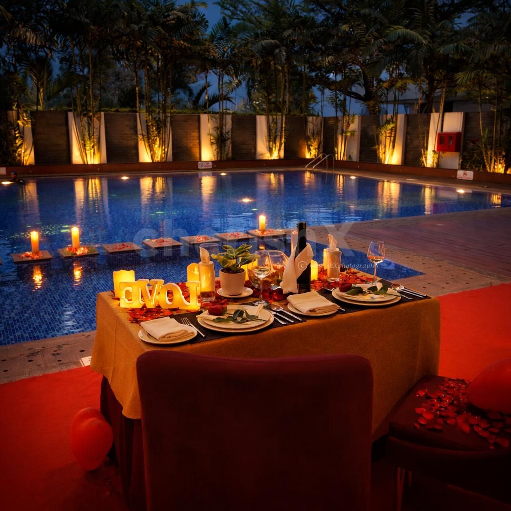Unwind into a romantic evening with a pool-view garden open-air candlelight dinner, crafted for couples who love calm surroundings, soft lighting, and meaningful conversations. Set amidst lush greenery with serene views of the pool, this open-air dining experience feels intimate yet refreshingly spacious.