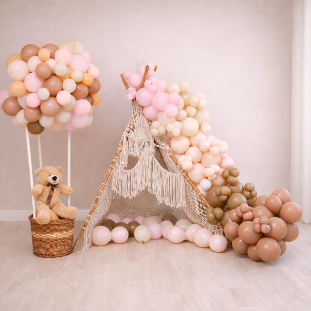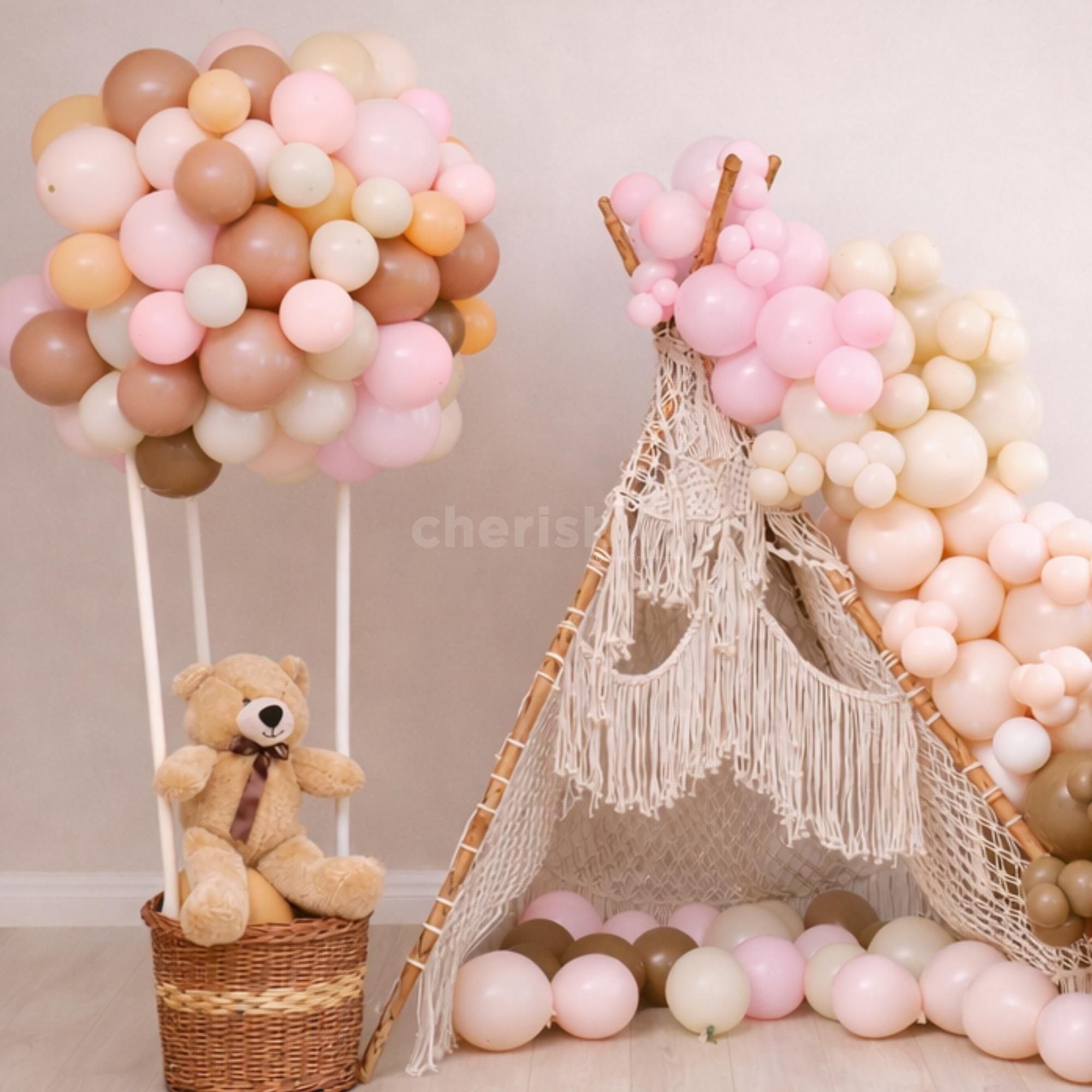 Arch of 250 balloons using choco brown inside carnation pink, choco brown, pastel peach inside white latex, vintage beige, and pastel pink