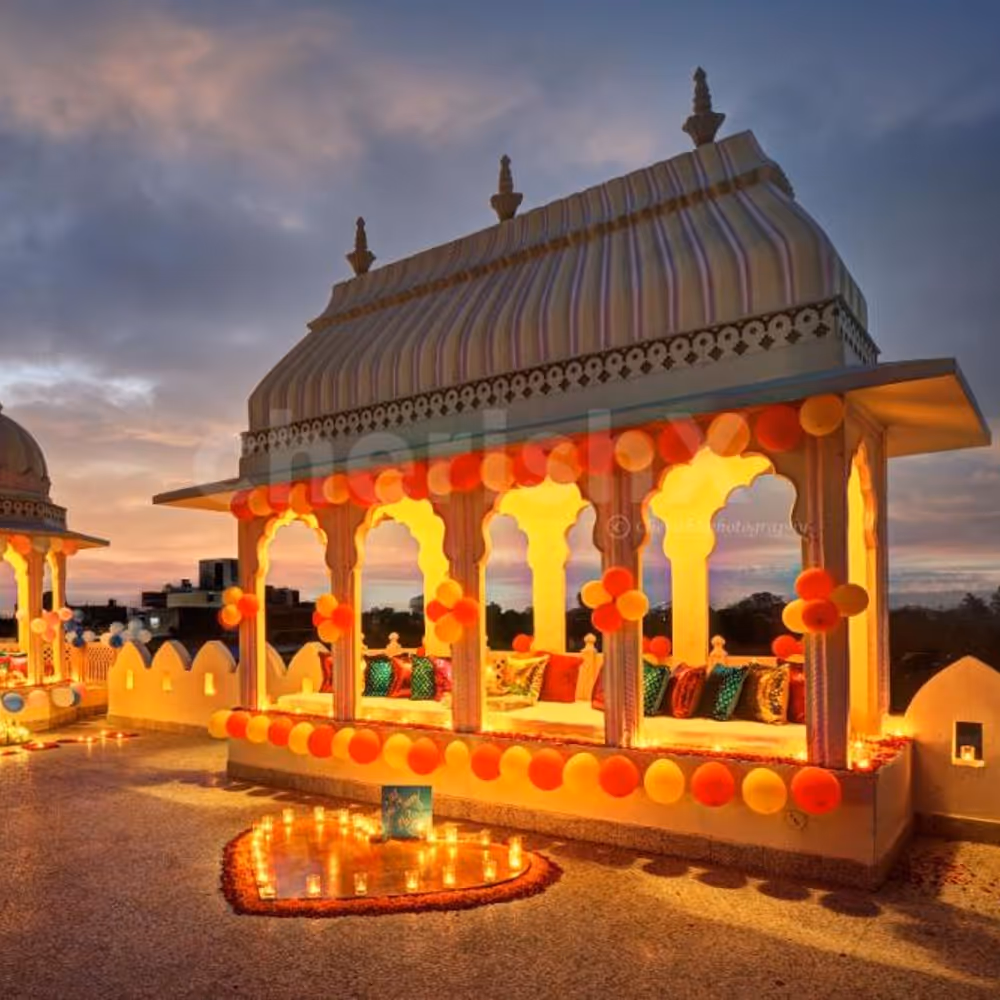 This is our Signature Candlelight Dinner. Baradari Is a Unique Heritage style dining concept that offers its diner a Unique Royal ambience and Feel, and delivers an unparalleled Experience to the guests. A Baradari is exclusively decorated per couple and it’s a Sit-down Dinner inside the same. Baradari is beautifully decorated with colorful theme based Balloons, Tea Lights, Roses, Marigolds, Dahlias, Aromatic Candles, & Sassy Glittery Cushions. One May dance or sing along on the romantic Music played in the background.