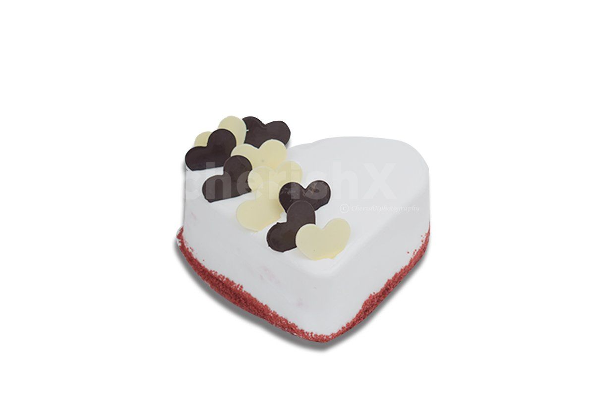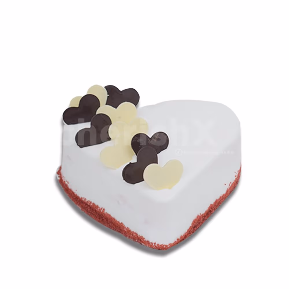 A heart is for love and so is the red colour. Most suitable for Valentines Day. Express love for beloved with this one.Try this pleasing red velvet cake with white coloured frosty layering & cute little white & milk choco heart flakes on top.