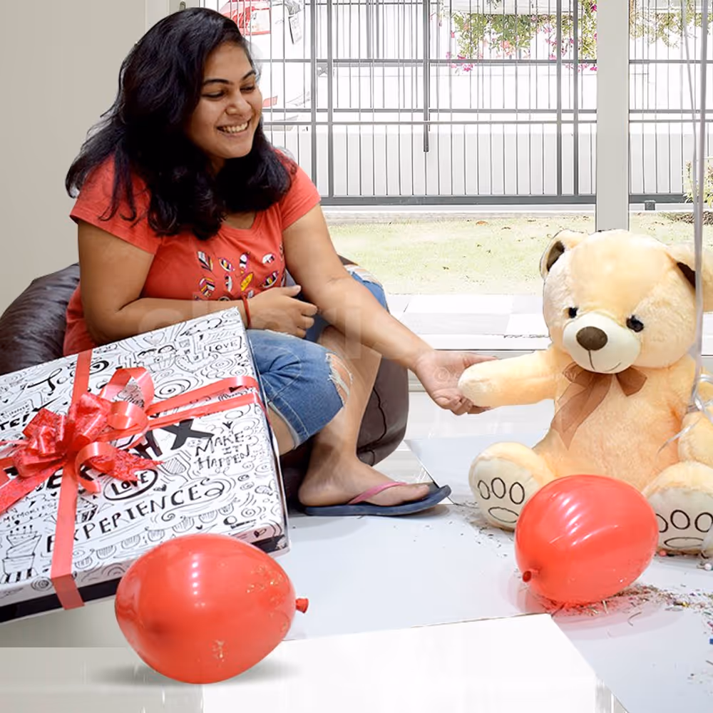 About the experience: Imagine the beautiful smile on your loved one's face when a CherishX box opens up and reveals a love-filled surprise: a cute teddy bear along with heart shaped balloons. Amazing, isn't it? Which is why we have curated just that for you, for the occasion of teddy day, valentine's day or hug day. This is the perfect surprise to suit all occasions. This unique and thoughtful gift consists of an exclusive cherishX surplosion box, an adorable teddy bear, and heart-shaped red balloons. Joy and happiness guaranteed! Maintain the element of surprise and get this gift delivered to a location of your choice. Don't hesitate, buy now and let your bae know that they are precious to you!