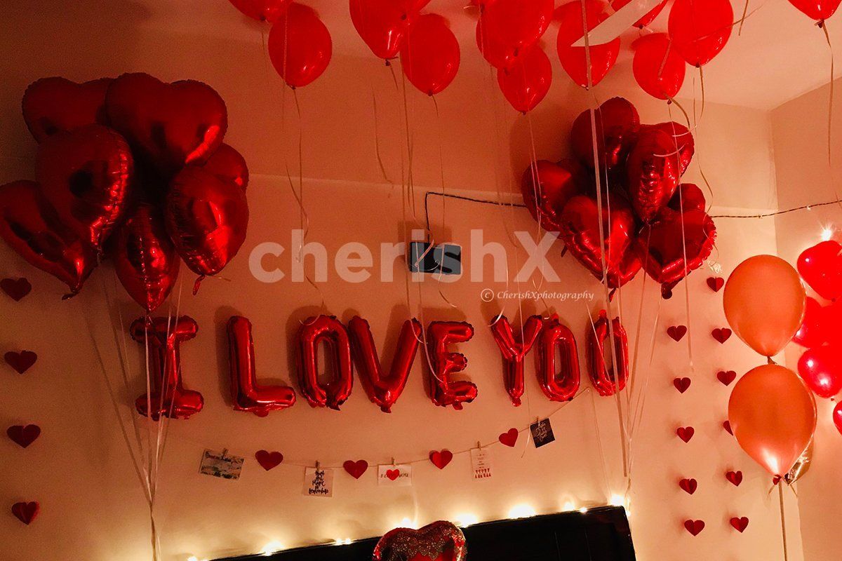 Its time for Cupid to strike with his bow and arrow and put some hearts around your home! Take a step back from life and allow us to play cupid for you. We will decorate your home and/or your room in the most magical way ever! With a red theme, balloons will be stuck to your ceiling in bunches with removable tape, and red foil balloons in the shape of hearts will be stuck in a cute way around either side of your bed. Along with that, alphabet foil balloons will be used to spell out the words "I LOVE YOU" bright and bold on the wall. Heart-shaped foil balloons will also be kept on the bed, and there will be strings of red hearts dangling from the walls and above the headboard, with cute messages attached to it. LED lights shall adorn and illuminate this decor! Win the heart of your loved one and create the most romantic ambience with this package!